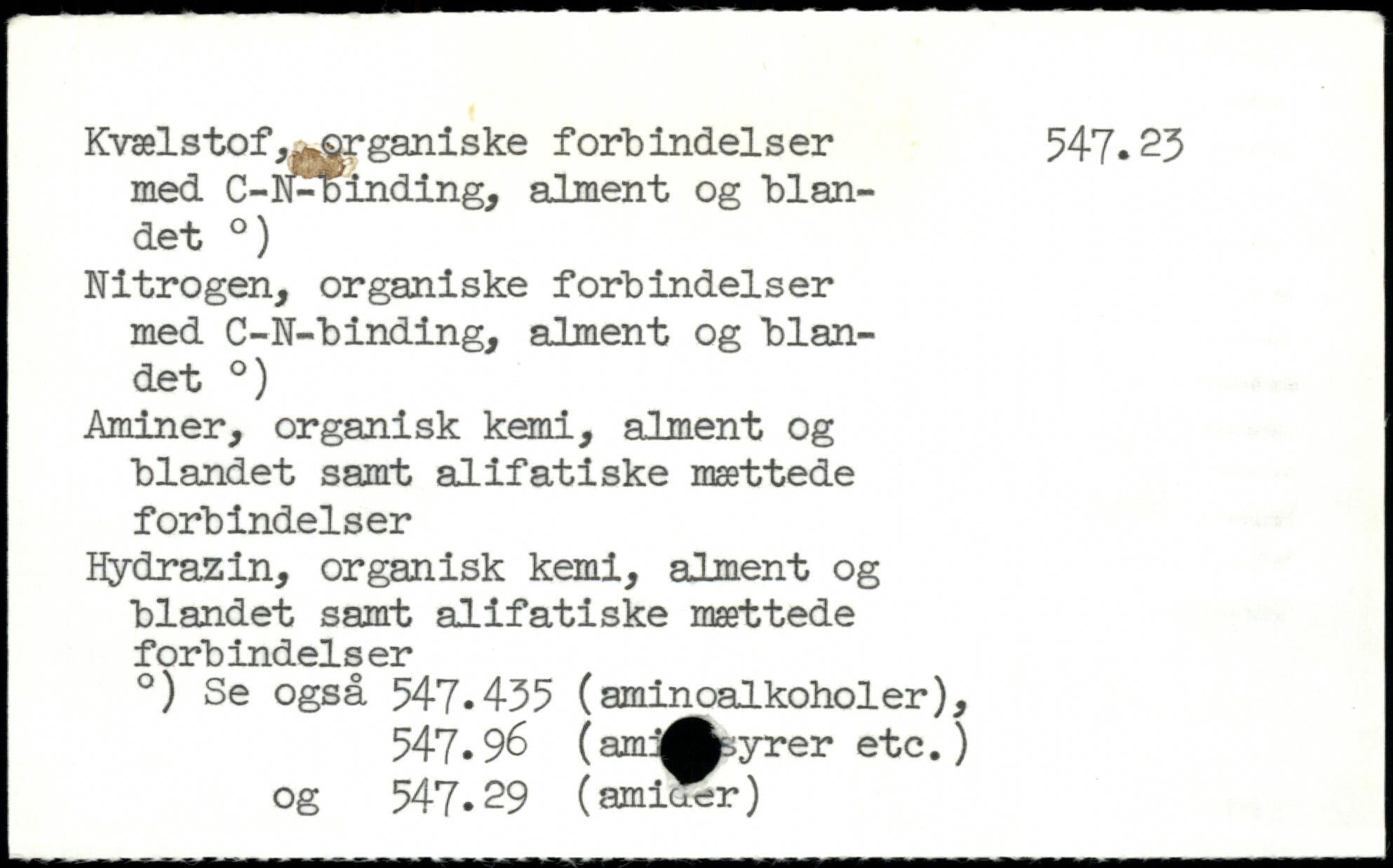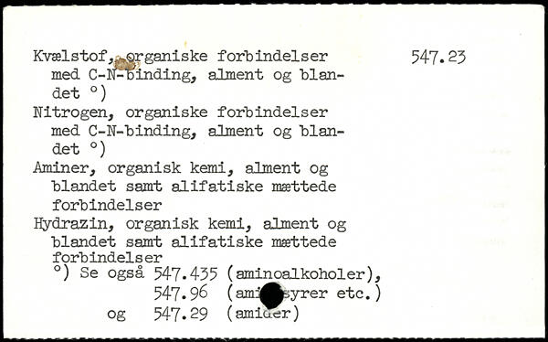 Kvælstof,organiske forbindelser 547.23 med C-N-binding, alment og blandet .) Nitrogen, organiske forbindelser med C-N-binding, alment og blandet .) Aminer, organisk kemi, alment og blandet samt alifatiske mættede forbindelser Hydrazin, organisk kemi, alment og blandet samt alifatiske mættede forbindelser .) Se også 547.455 (aminoalkoholer), 547.96 (anq^eyrer etc.) og 547. 29 (amiSr)