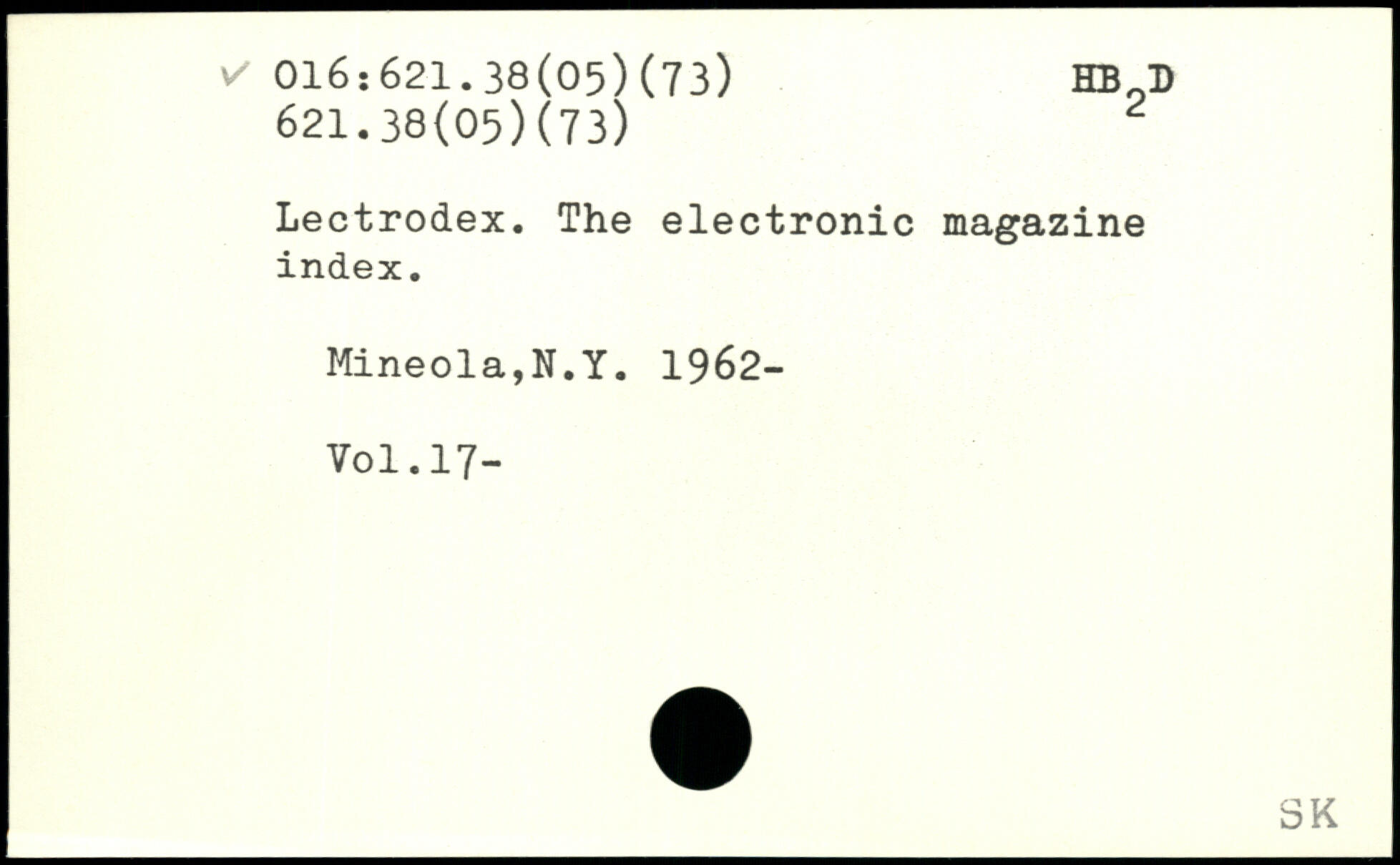 Lectrodex. The electronic magazine index. Mineola,N.Y. 1962-V0I.I7-
