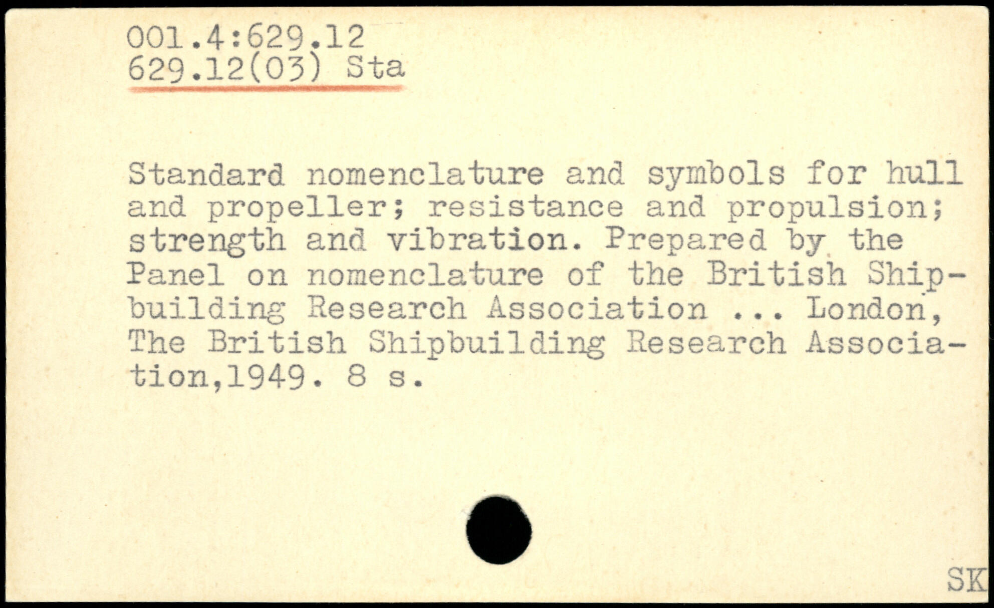 Standard nomenclature and symbols for hull and propeller; resistance and propulsion; strength and vibration. Prepared by the Panel on nomenclature of the British Shipbuilding Research Association ... London, The British Shipbuilding Research Association, 1949.