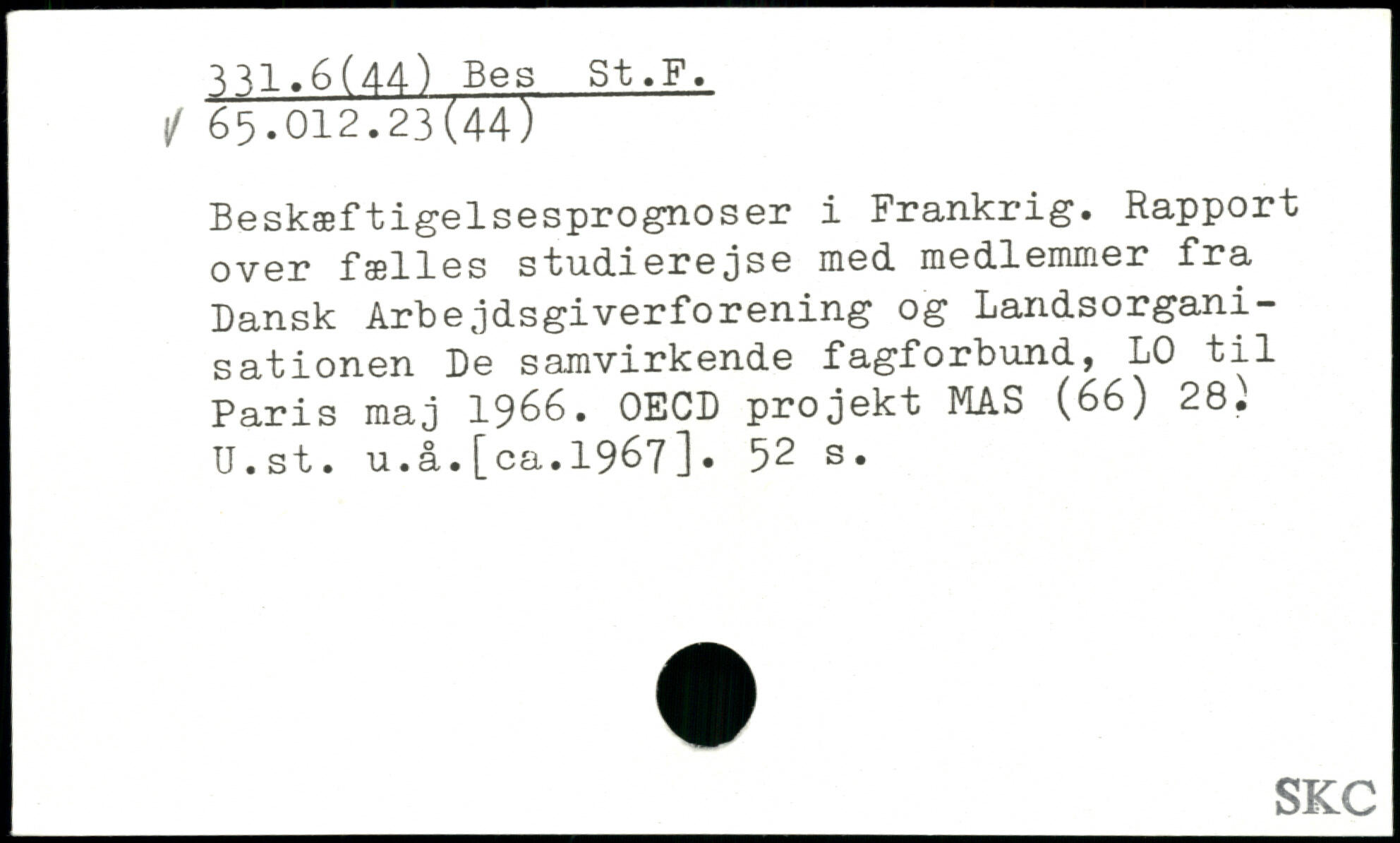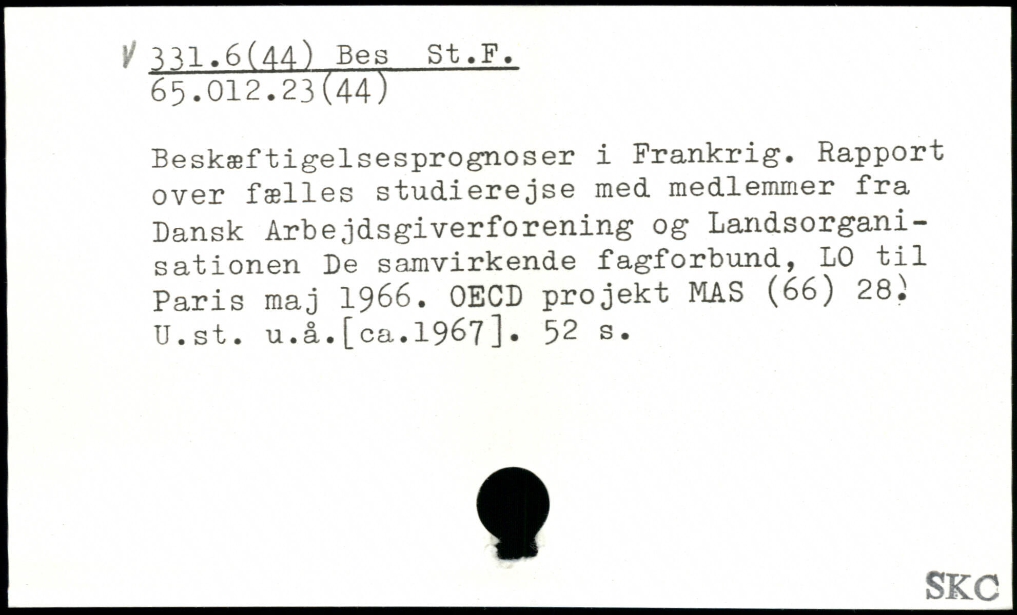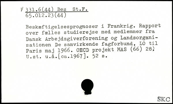 Beskæftigelsesprognoser i Frankrig. Rapport over fælles studierejse med medlemmer fra Dansk Arbejdsgiverforening og Landsorganisationen De samvirkende fagforbund, LO til Paris maj 1966. OECD projekt MAS (66) 28. U.st. u.å.[ca.1967].