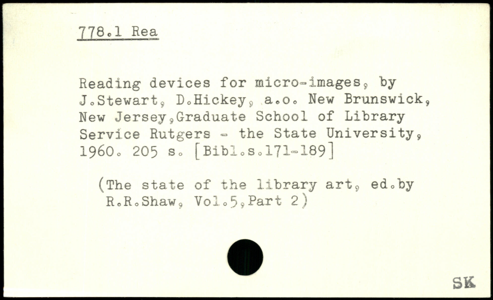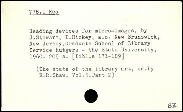 Reading devices for micro=images, by JoStewart, LoHickey, a.o. New Brunswick, New Jersey,Graduate School of Library Service Rutgers - the State University, 19600