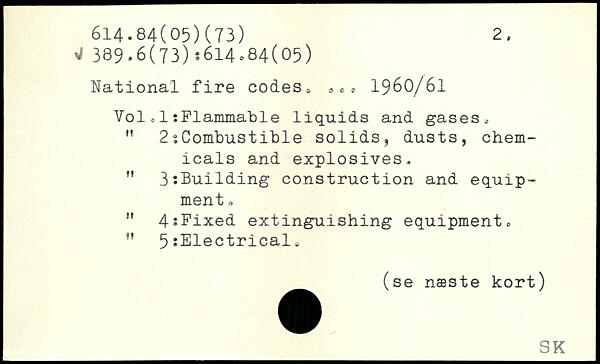 National fire codes- 1960/6I Vol,1:Flammable liquids and gases, M 2 % Combustible solids, dusts, chemicals and explosives. M 3:Building construction and equipment , " 4iFixed extinguishing equipment, " 5^Electricalc
