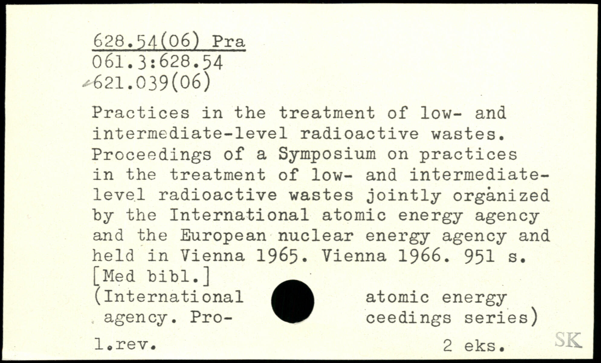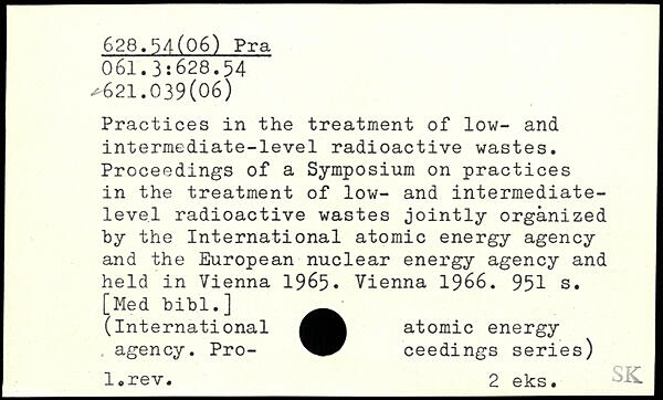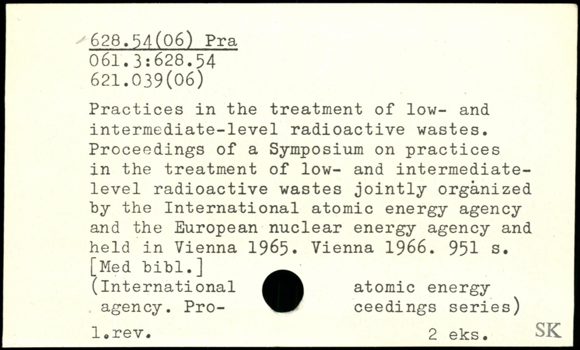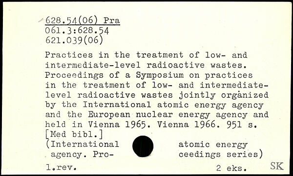 Practices in the treatment of low- and intermediate-level radioactive wastes. Proceedings of a Symposium on practices in the treatment of low- and intermediate-level radioactive wastes jointly organized by the International atomic energy agency and the European nuclear energy agency and held in Vienna 1965. Vienna 1966.