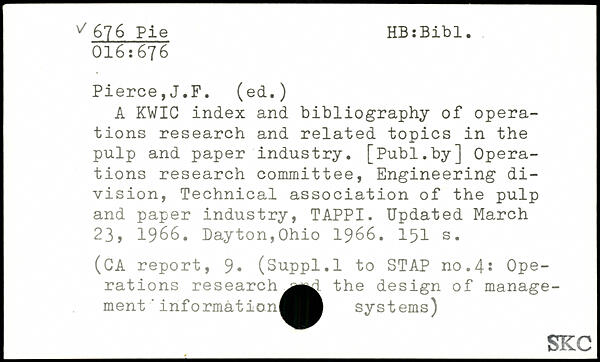 A KWIC index and bibliography of operations research and related topics in the pulp and paper industry.