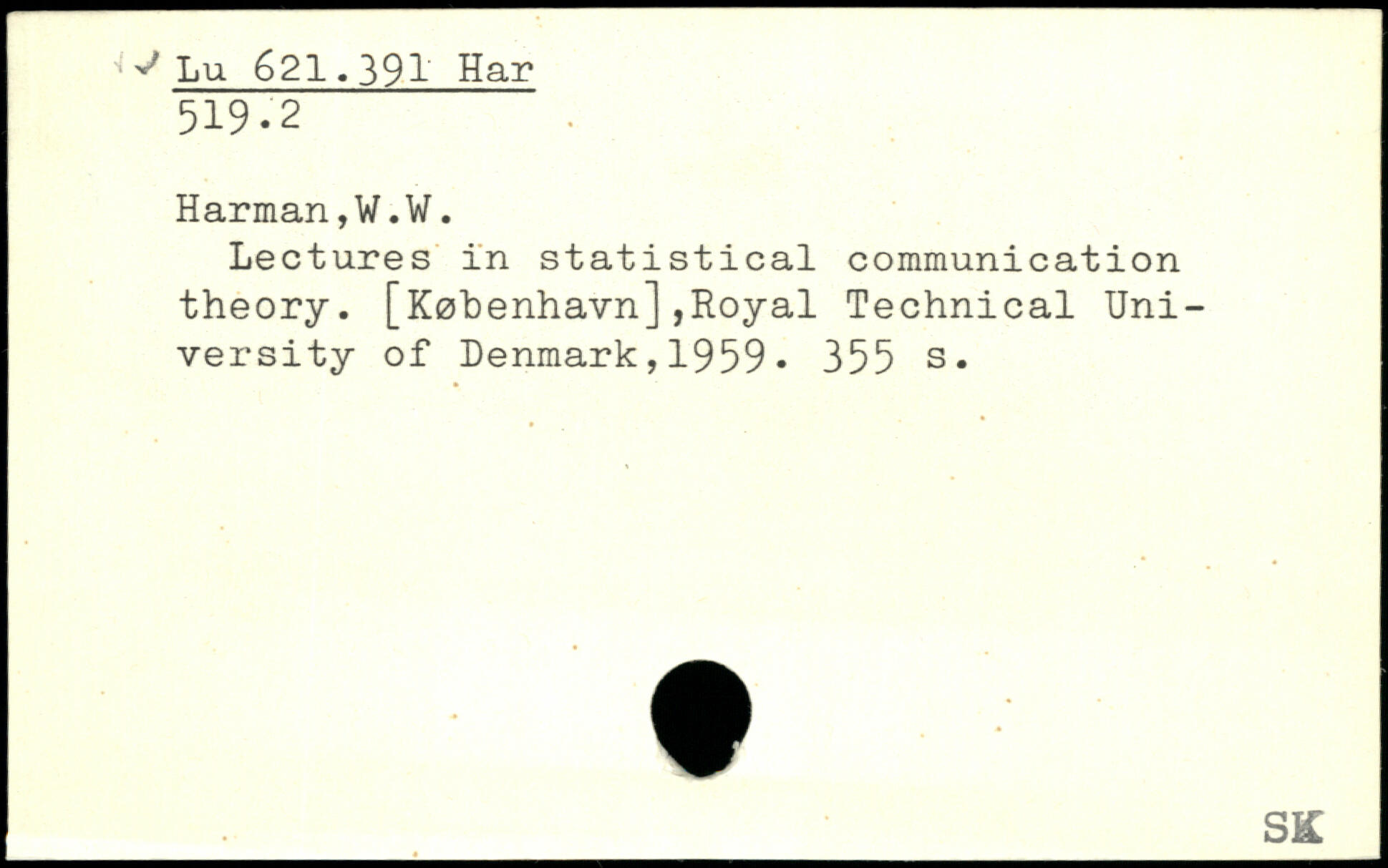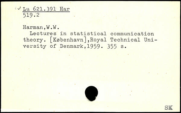 Lectures in statistical communication theory. [København],Royal Technical University of Denmark,1959.