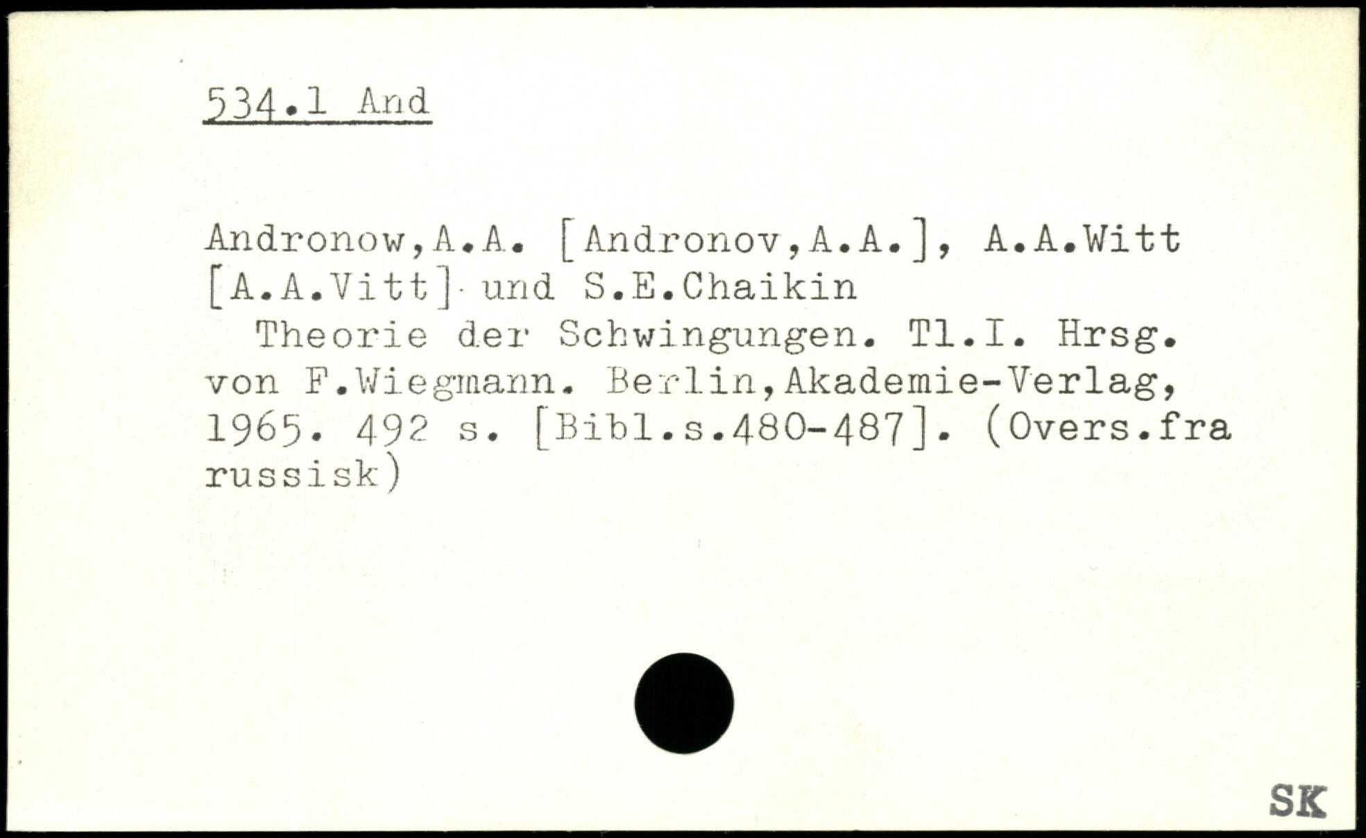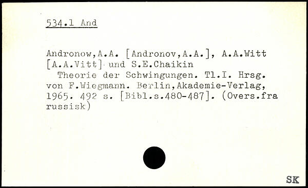 Andronow,A.A. [Andronov,A.A.], A.A.Witt [A.A.Vitt]-und S.E.Chaikin Theorie der Schwingungen. Tl.I. Hrsg, von F.Wiegmann. Berlin,Akademie-Verlag, ; 1965.