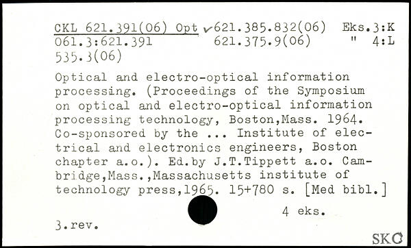 Optical and electro-optical information processing. (Proceedings of the Symposium on optical and electro-optical information processing technology, Boston,Mass. 1964. Co-sponsored by the ... Institute of electrical and electronics engineers, Boston chapter a.o.). Ed.by J.T.Tippett a.o. Cambridge,Mass. ,Massachusetts institute of technology press,1965.