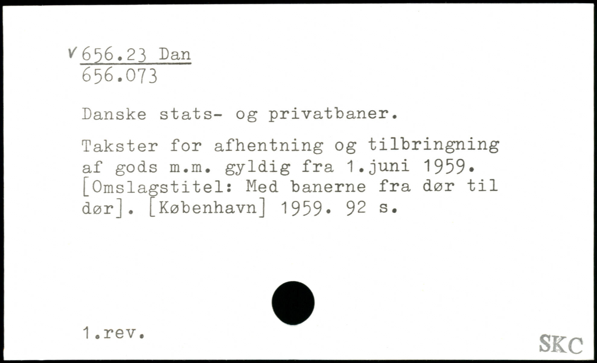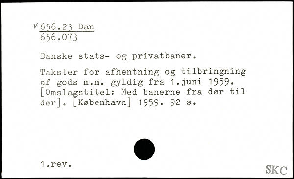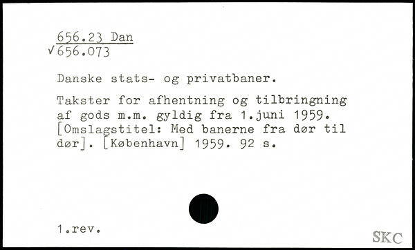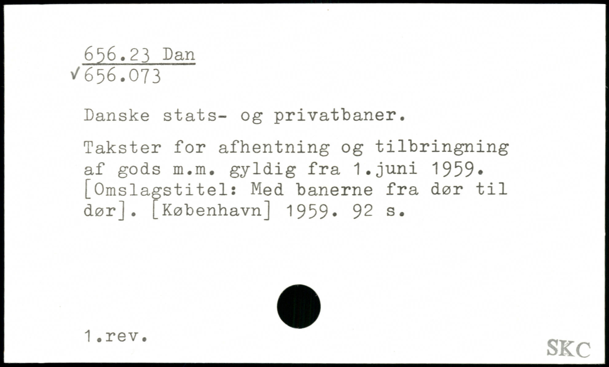 Danske stats- og privatbaner. Takster for afhentning og tilbringning af gods m.m. gyldig fra 1.juni 1959, [Omslagstitel: Med banerne fra dør til dør].