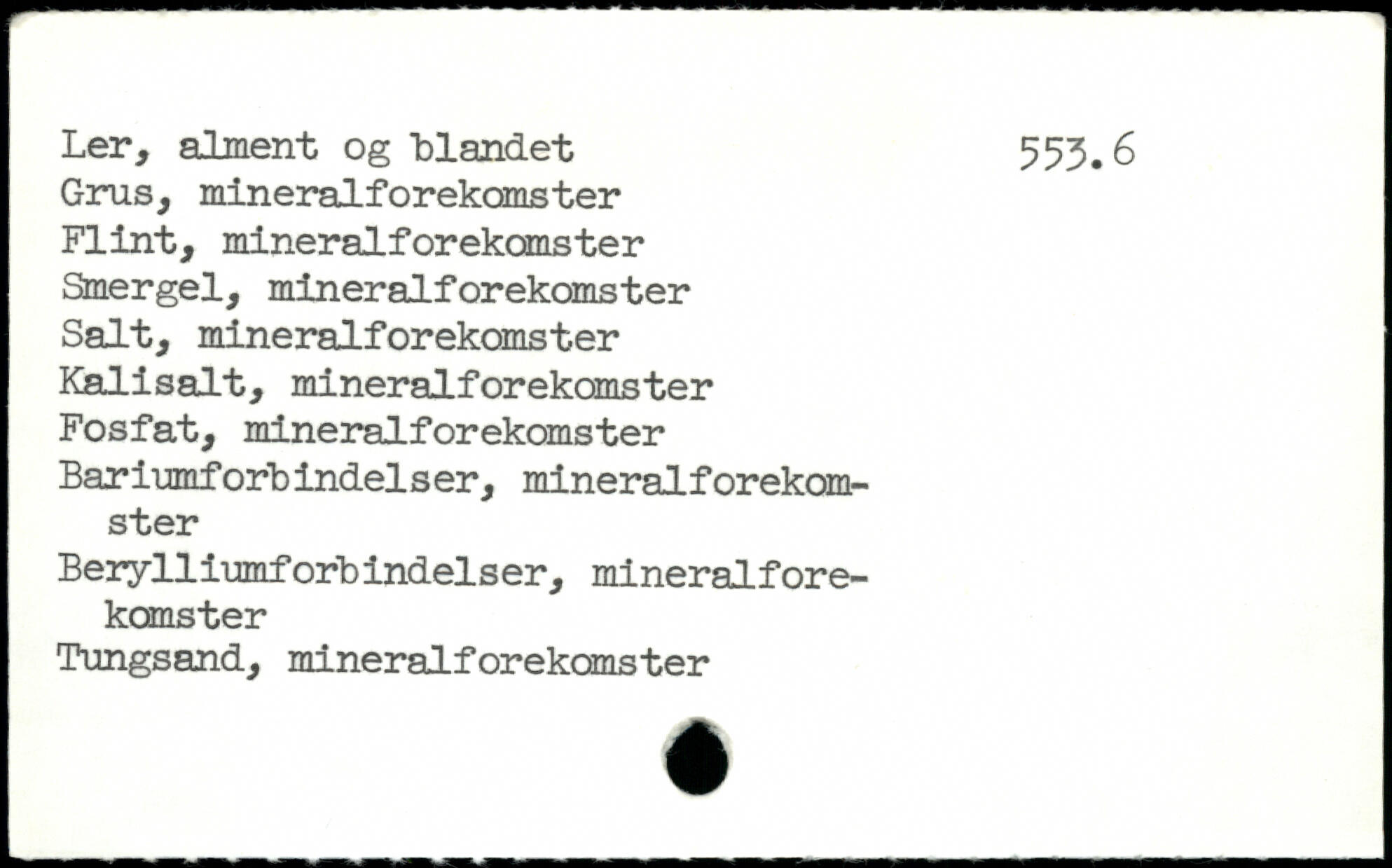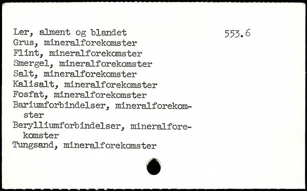Ler, alment og blandet 553.6 Grus, mineralforekomster Flint, mineralforekomster Smergel, mineralforekomster Salt, mineralforekomster Kalisalt, mineralforekomster Fosfat, mineralforekomster Bariumforbindelser, mineralforekomster Beiylliumforbindelser, mineralforekomster Tungsand, mineralforekomster