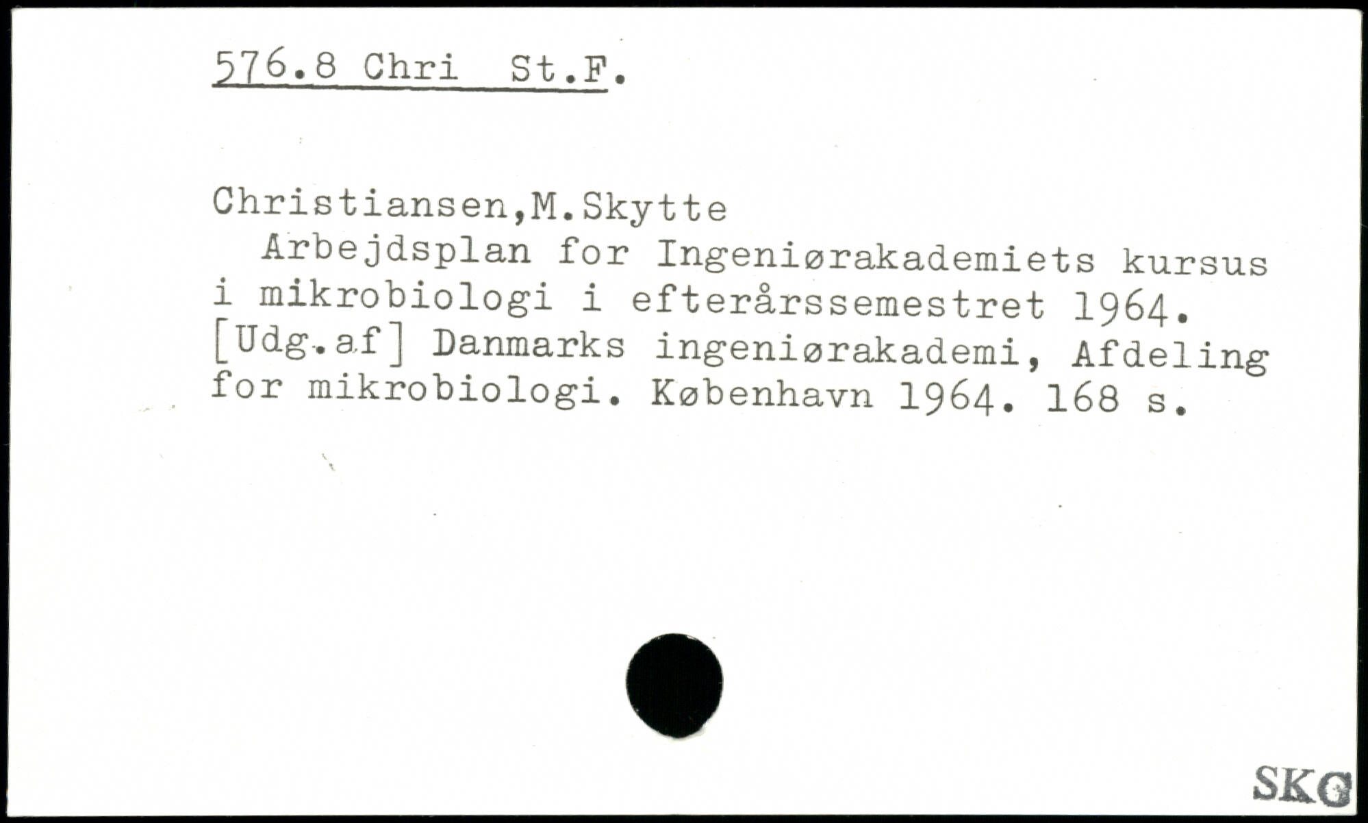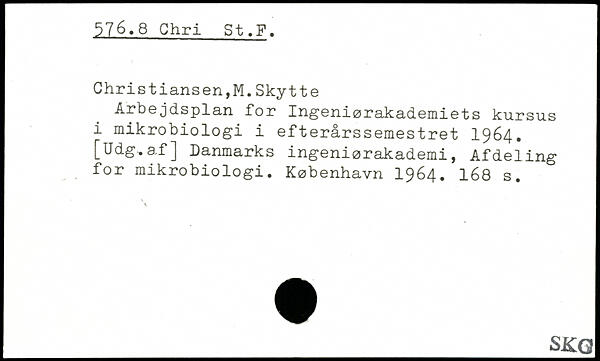 Christiansen,M.Skytte Arbejdsplan for Ingeniørakademiets kursus i mikrobiologi i efterårssemestret 1964. [Udg.af] Danmarks ingeniørakademi, Afdeling for mikrobiologi.