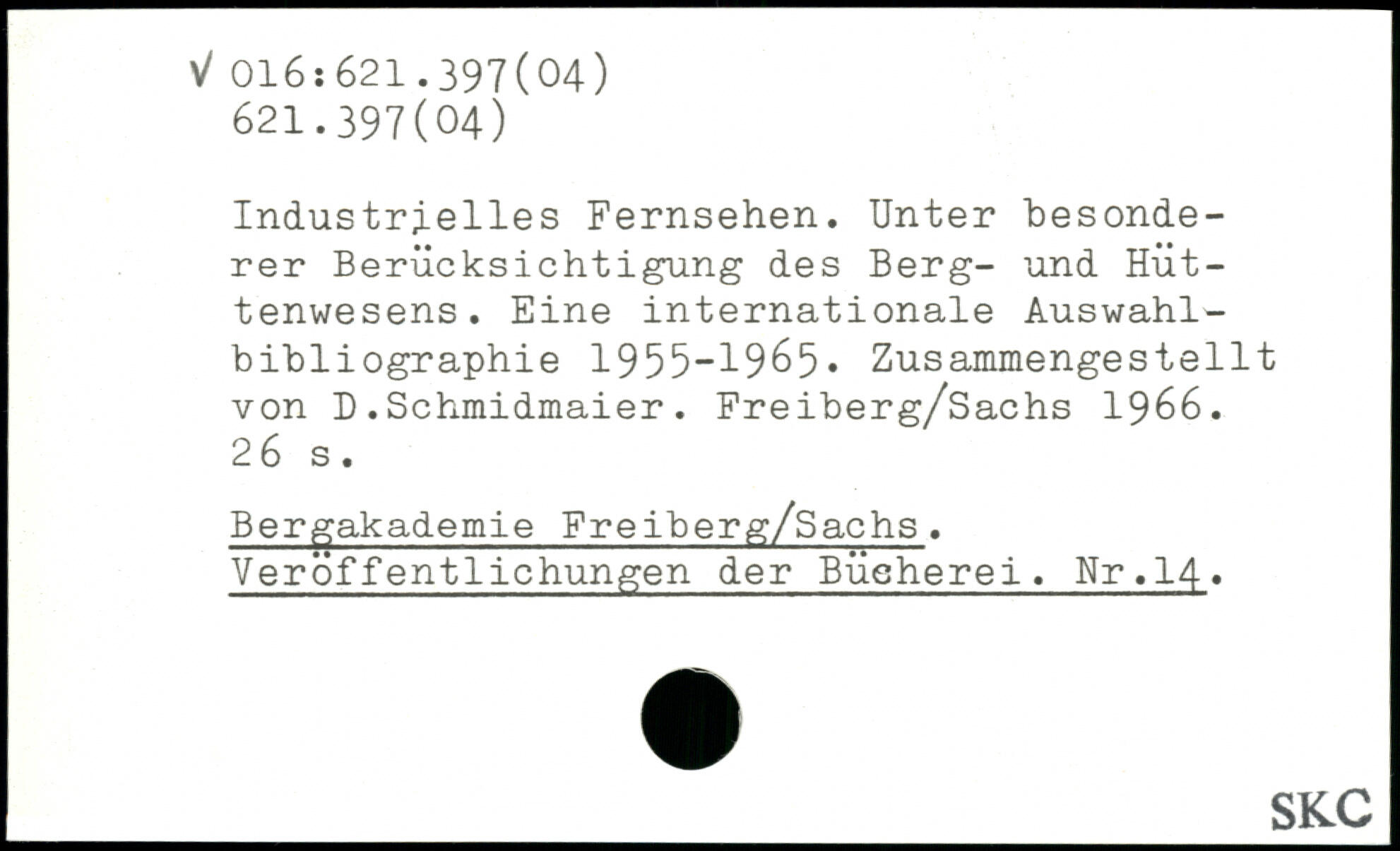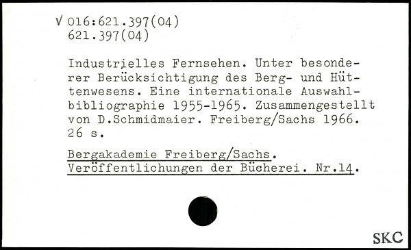Industrielles Fernsehen. Unter besonderer Berücksichtigung des Berg- und Hüttenwesens. Eine internationale Auswahlbibliographie 1955-1965. Zusammengesteilt von D.Schmidmaier. Freiberg/Sachs 1966. 2