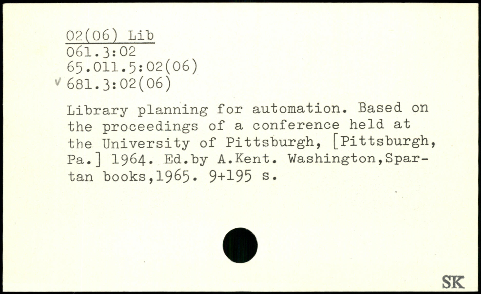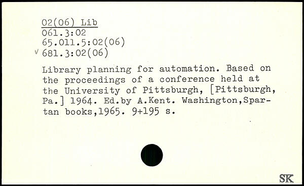 Library planning for automation. Based on the proceedings of a conference held at the University of Pittsburgh, [Pittsburgh, Pa.] 1964. Ed.by A.Kent.
