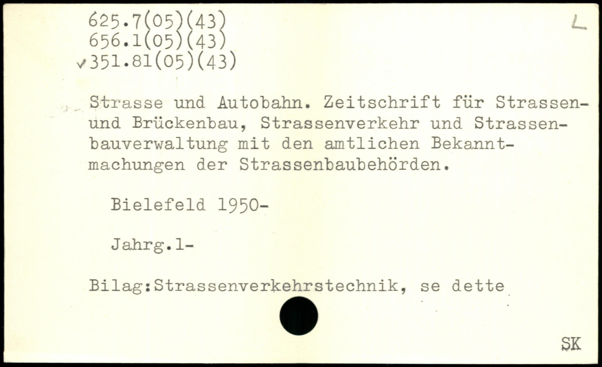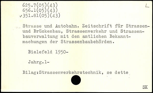 Strasse und Autobahn. Zeitschrift für Strassen-und Brückenbau, Strassenverkehr und Strassen-bauverwaltung mit den amtlichen Bekanntmachungen der Strassenbaubehörden. Bielefeld 1950- Jahrg.l- Bilag;Strassenverkehrstechnik, se dette