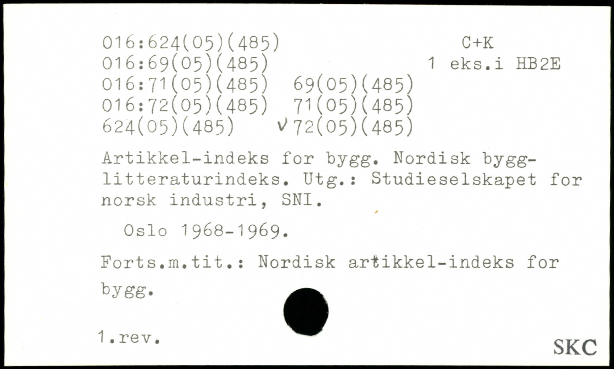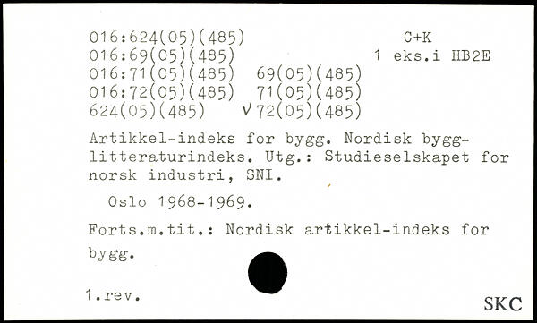 Artikkel-indeks for bygg. Nordisk bjgg-litteraturindeks. Utg.: Studieselskapet for norsk industri, SNI. Oslo 1968-1969. Forts.m.tit.î Nordisk artikkel-indeks for byge- ' " ’ ' SKC