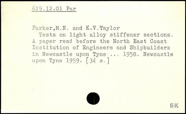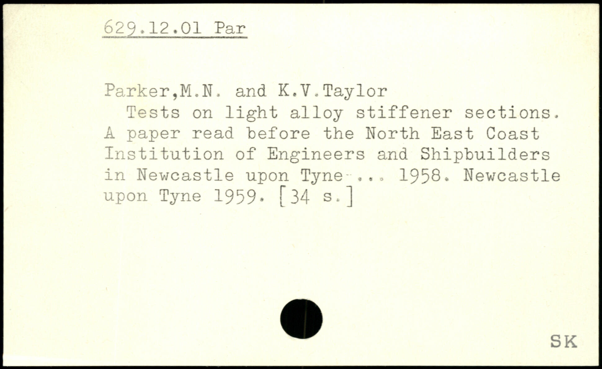 Parker,M.N, and K.V.Taylor Tests on light alloy stiffener sections. A paper read before the North East Coast Institution of Engineers and Shipbuilders in Newcastle upon Tyne... 1958. Newcastle upon Tyne 1959. [