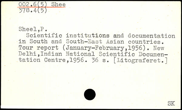 Scientific institutions and documentation in South and South-East Asian countries. Tour report (January-February,1956). New Delhi,Indian National Scientific Documentation Centre,1956.
