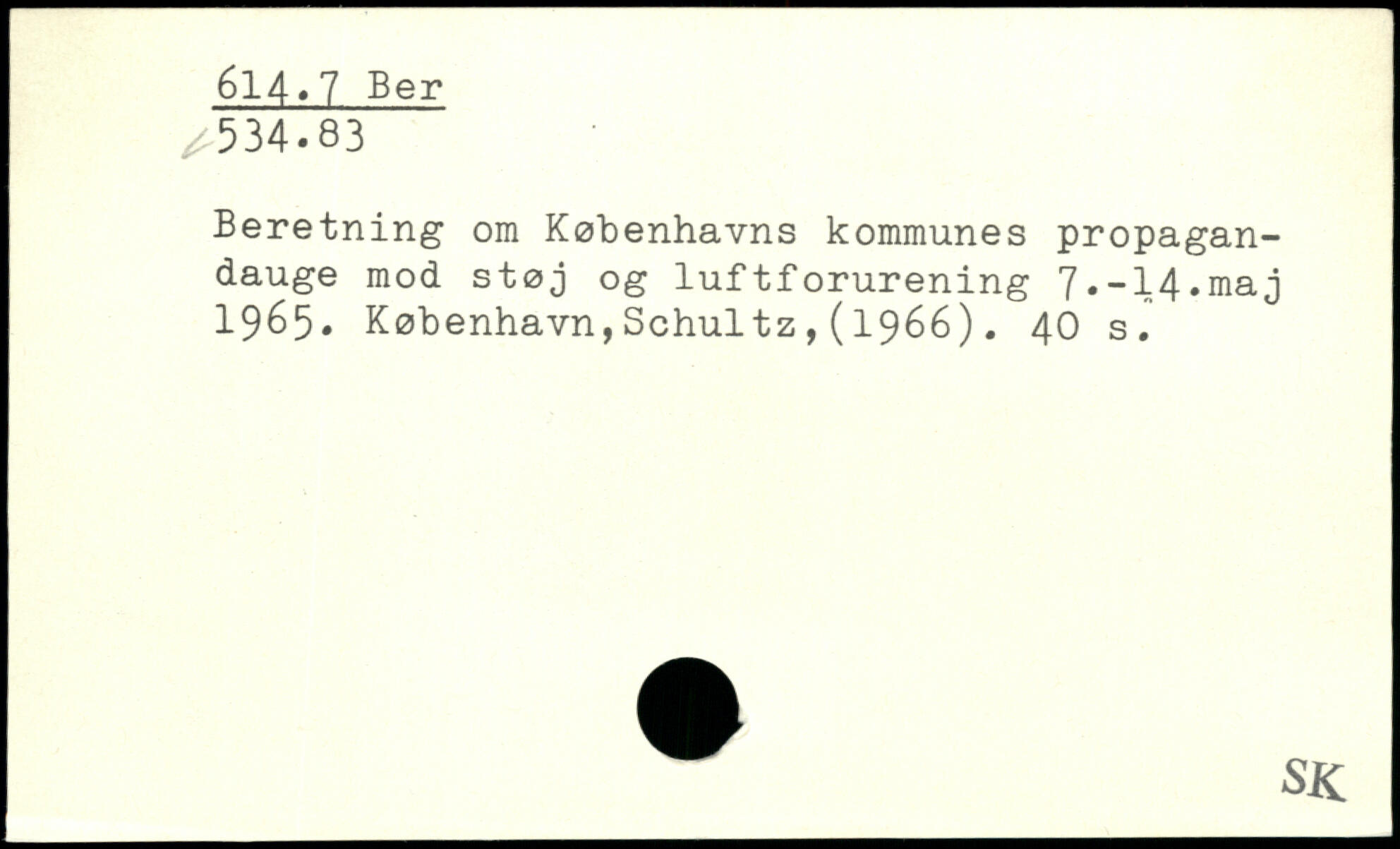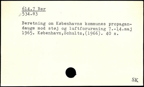 Beretning om Københavns kommunes propagandauge mod støj og luftforurening 7.-14.niaj 1965. København,Schultz,(1966).