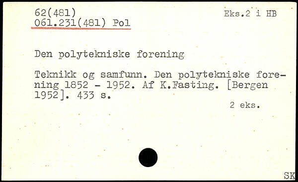 Den polytekniske forening Teknikk og samfunn. Den polytekniske forening 1852 - 1952. Af K.Dasting.