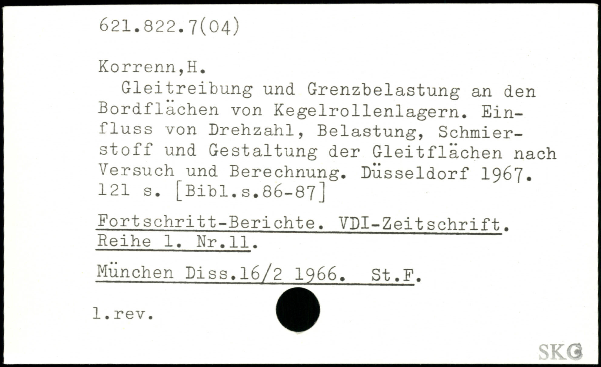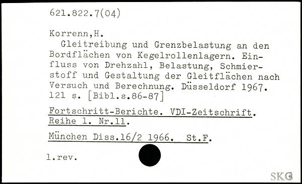 Gleitreibung und Grenzbelastung an den Bordflächen von Kegelrollenlagern. Einfluss von Drehzahl, Belastung, Schmierstoff und Gestaltung der Gleitflächen nach Versuch und Berechnung. Düsseldorf 1967.