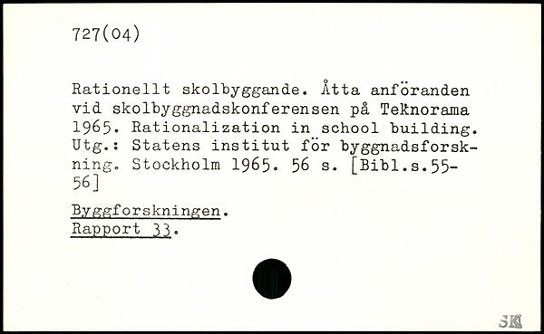 Rationellt skolbyggande. Åtta anföranden vid skolbyggnadskonferensen på TeRnorama 1965. Rationalization in school building. Utg.: Statens institut för byggnadsforsk-ning.