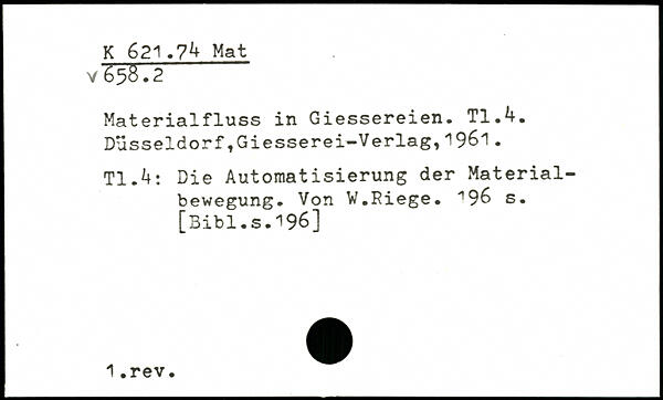 Materialfluss in Giessereien. TI.k. DüsseldorftGiesserei-Verlag,1961. TI.4: Die Automatisierung der Materialbewegung. Von W.Riege. ^