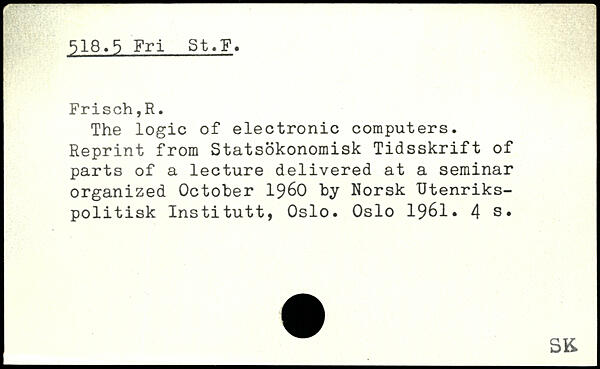 The logic of electronic computers. Reprint from Statsokonomisk Tidsskrift of parts of a lecture delivered at a seminar organized October 1960 by Norsk IJtenriks-politisk Institutt, Oslo. Oslo 1961.