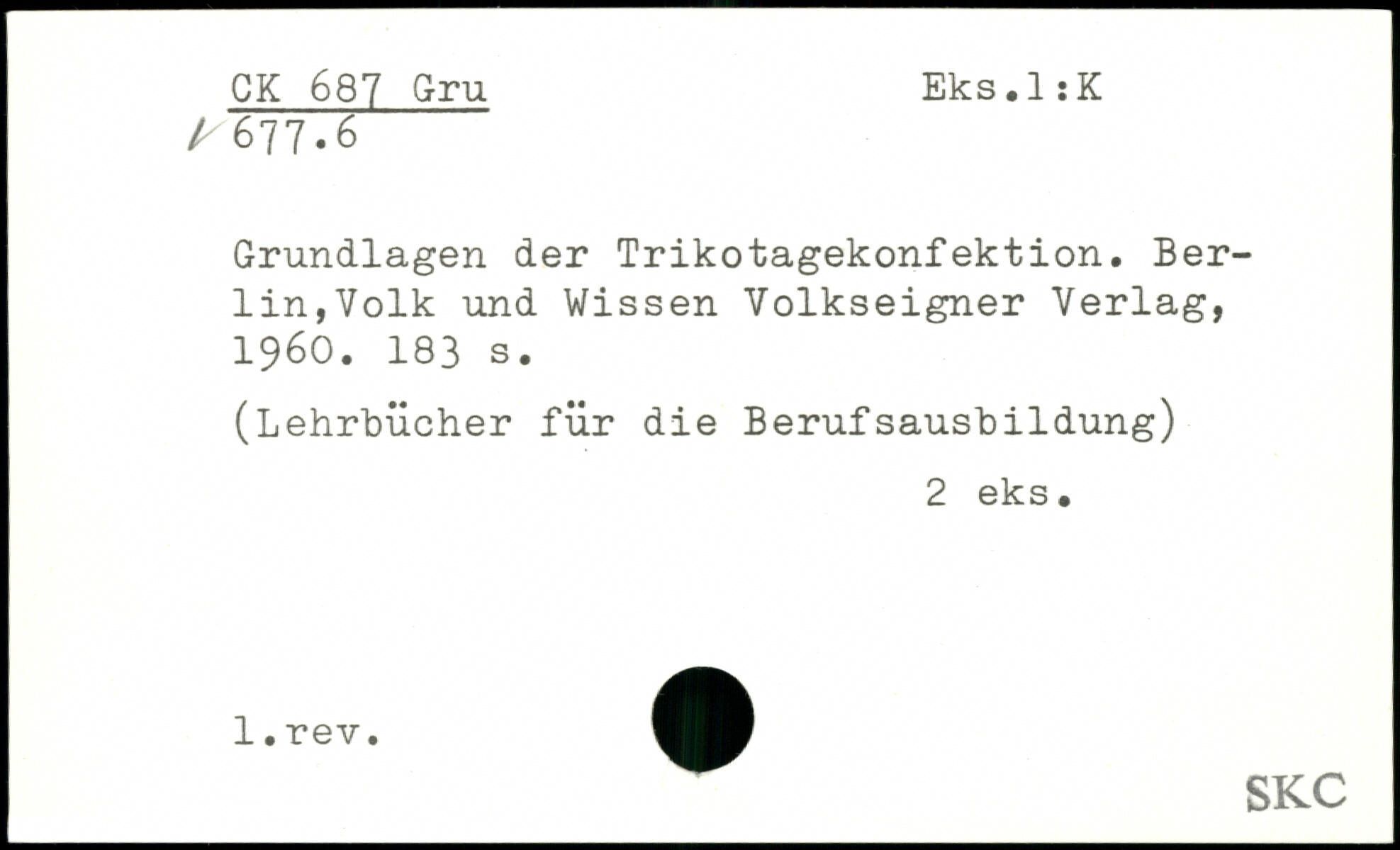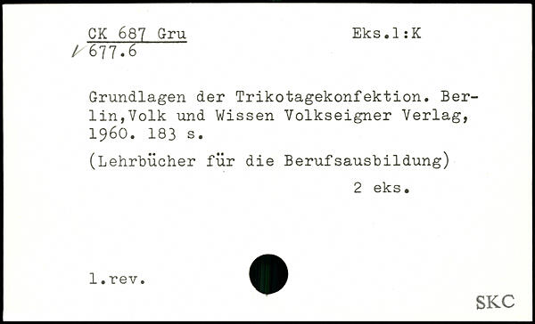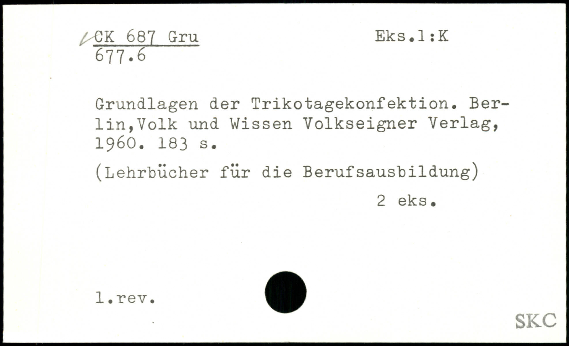 Grundlagen der Trikotagekonfektion. Berlin,Volk und Wissen Volkseigner Verlag, 1960.