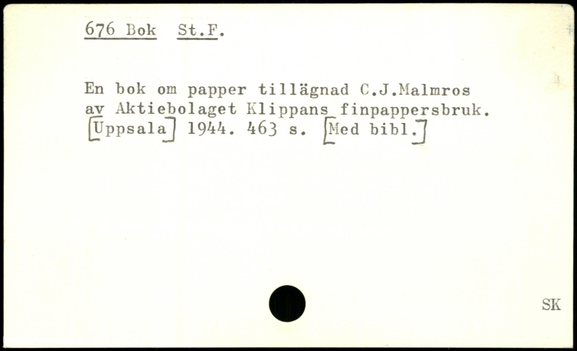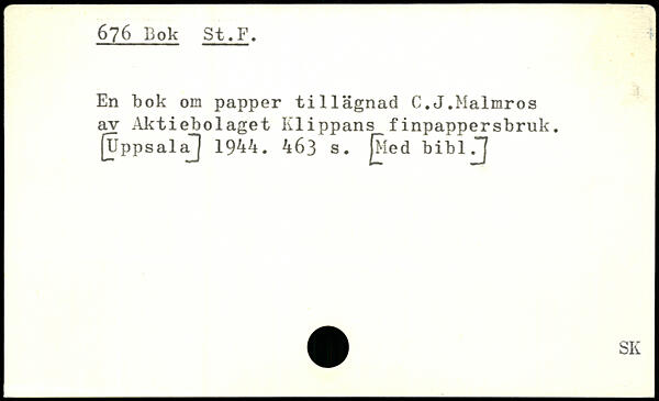 En bok om papper tillägnad C.J.Malmros av Aktiebolaget Klippans finpappersbruk. (Uppsalaj 1944.