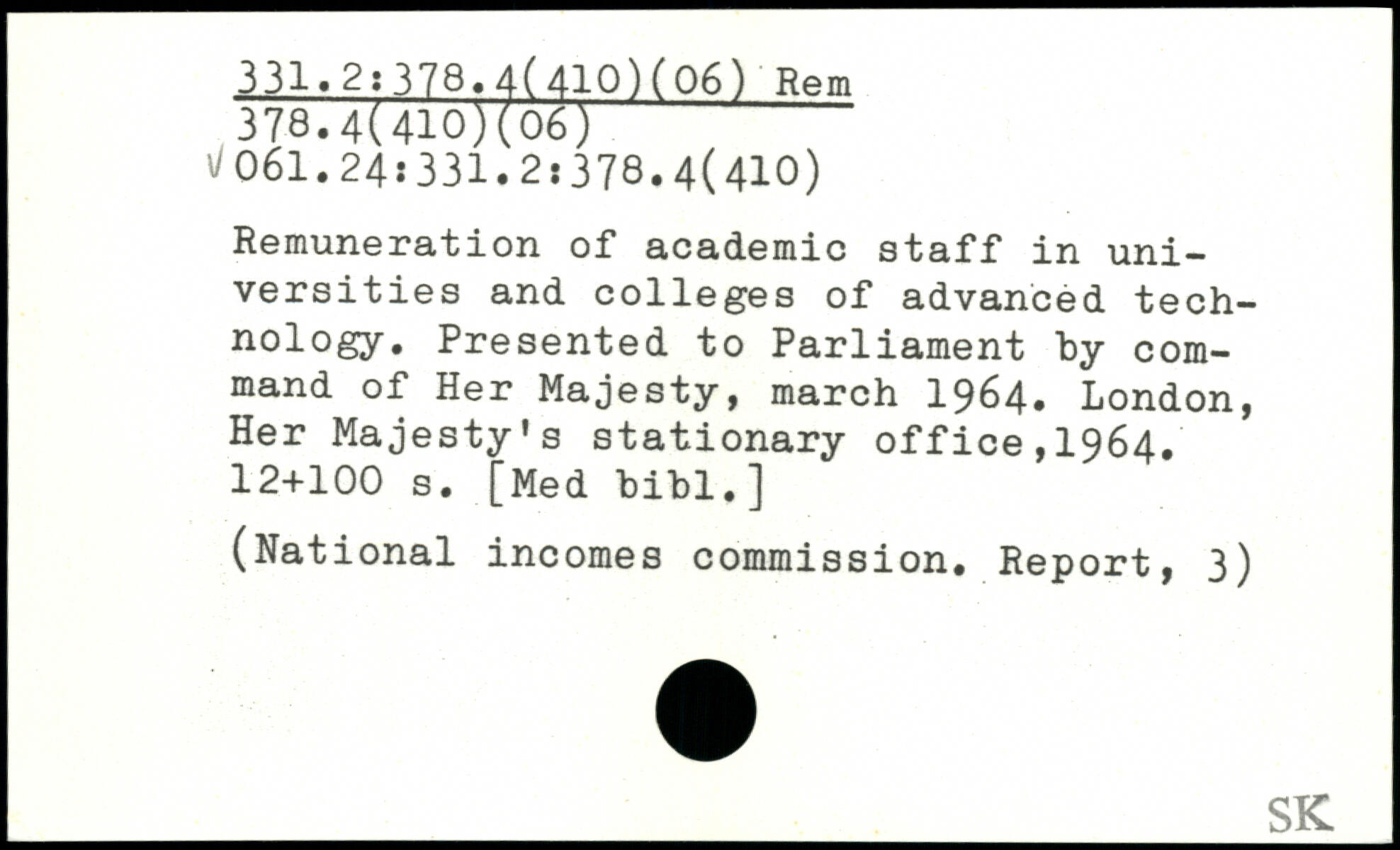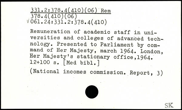 Remuneration of academic staff in universities and colleges of advanced technology. Presented to Parliament hy command of Her Majesty, march 1964. London, Her Majesty's stationary office,1964.