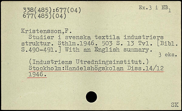 Studier i svenska textila industriers struktur. Sthlm.1946.