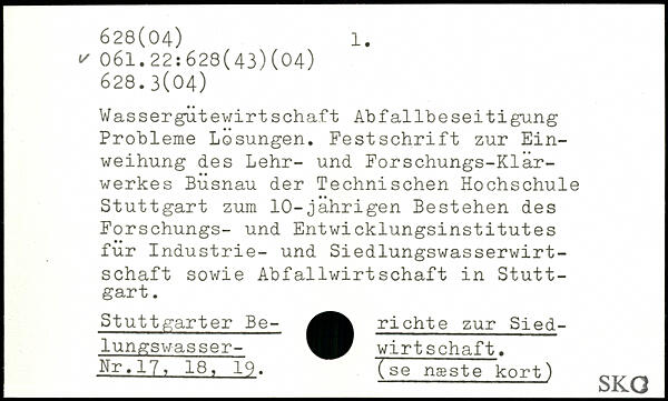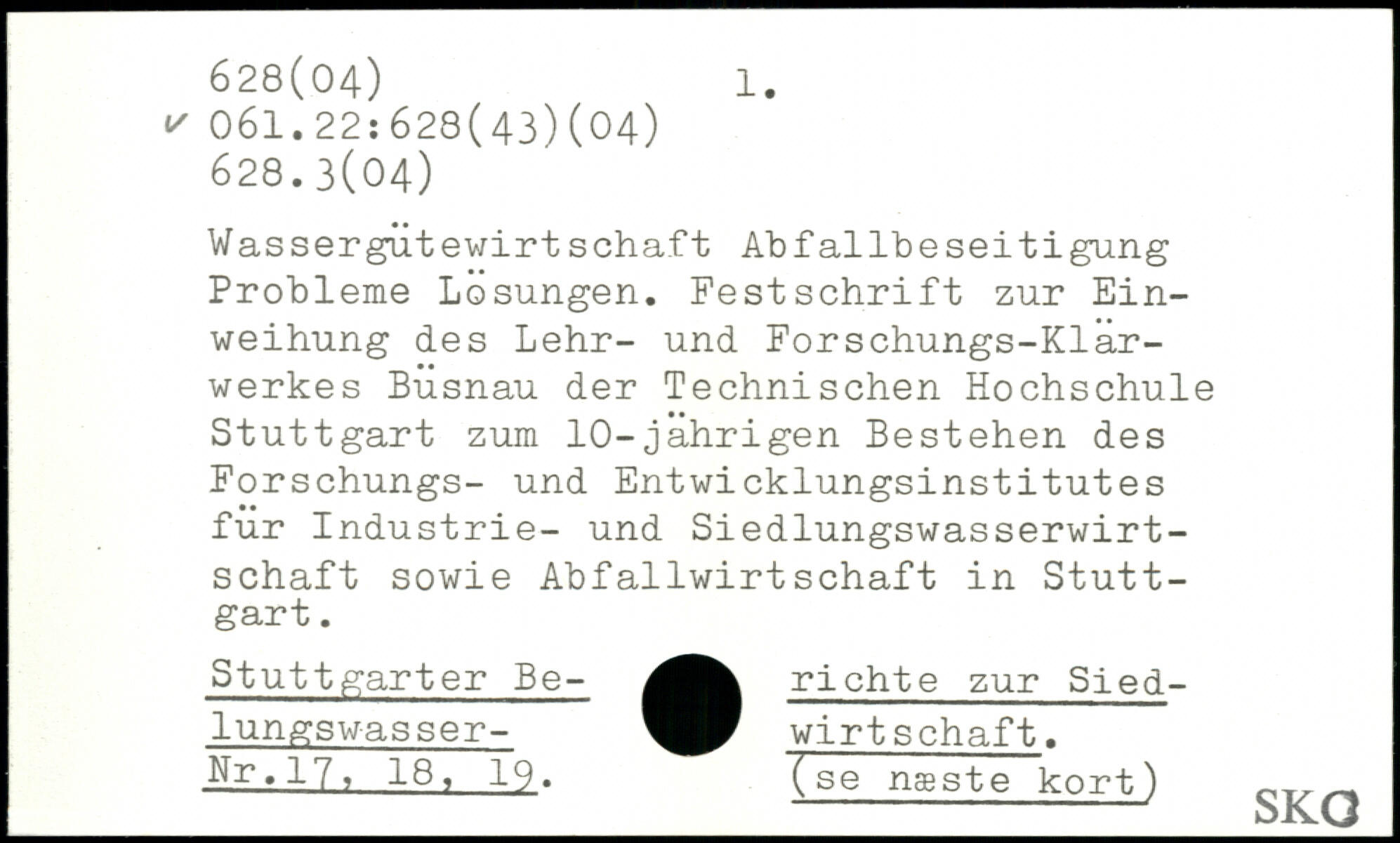 Wassergùtewirt schaft Abfallbeseitigung Probleme Losungen. Festschrift zur Einweihung des Lehr- und Forschungs-Klärwerkes Busnau der Technischen Hochschule Stuttgart zum 10-jahrigen Bestehen des Forschungs- und Entwicklungsinstitutes für Industrie- und Siedlungswasserwirtschaft sowie Abfallwirtschaft in Stuttgart. Stuttgarter Be- richte zur Siedlungswasser- Wirtschaft. Nr.17, 18, 19. (se næste kort) oKXJ