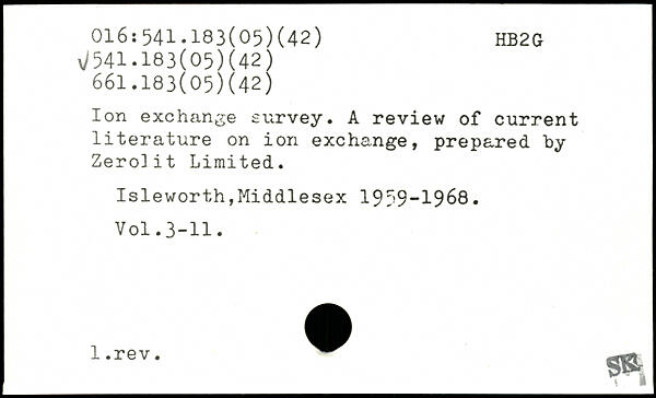 Ion exchange survey. A review of current literature on ion exchange, prepared by Zero!it Limited. Isleworth,Middlesex 1959-1968.