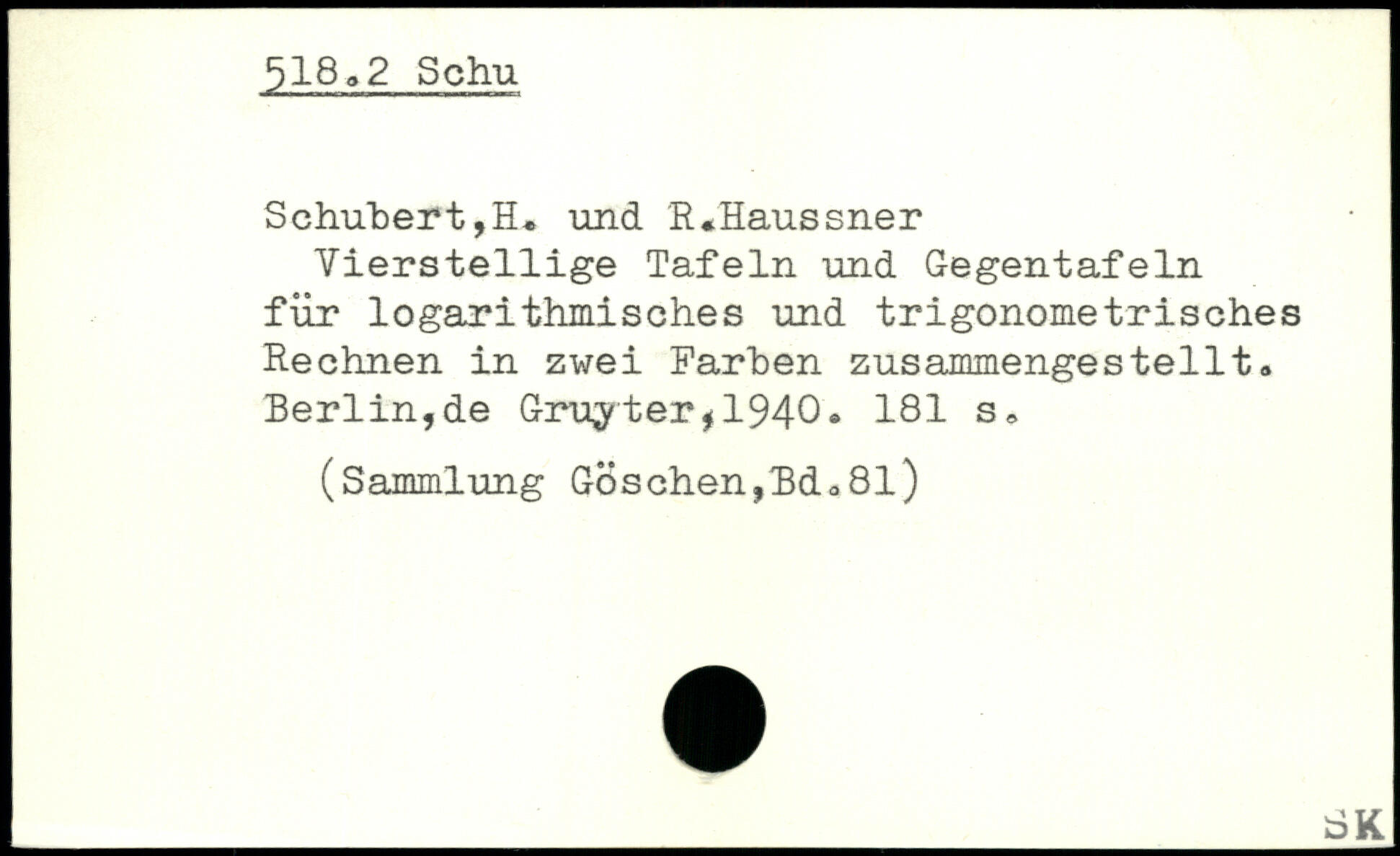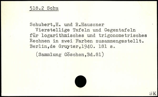 Vierstellige Tafeln und Gegentafeln für logarithmisches und trigonometrisches Rechnen in zwei Farben zusammengestellt,, Berlin,de Gru^ter#1940.