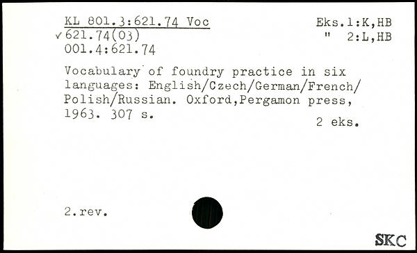 Vocabulary of foundry practice in six languages: English/Czech/German/French/ Polish/Russian.