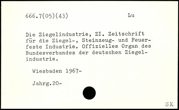 Die Ziegelindustrie, ZI. Zeitschrift für die Ziegel-, Steinzeug- und Feuerfeste Industrie. Offizielles Organ des Bundesverbandes der deutschen Ziegelindustrie. Wiesbaden 1967- Jahrg.20- !