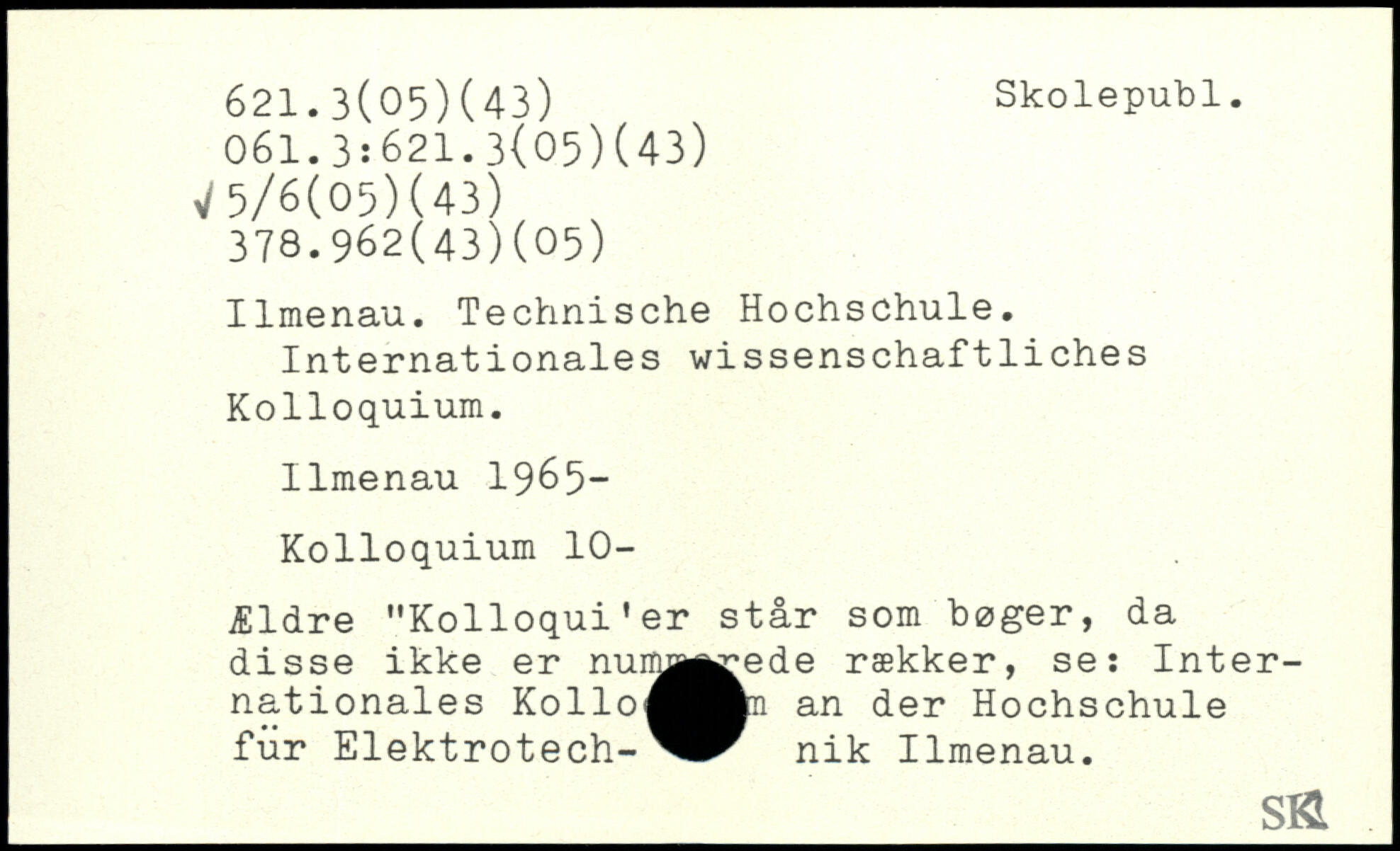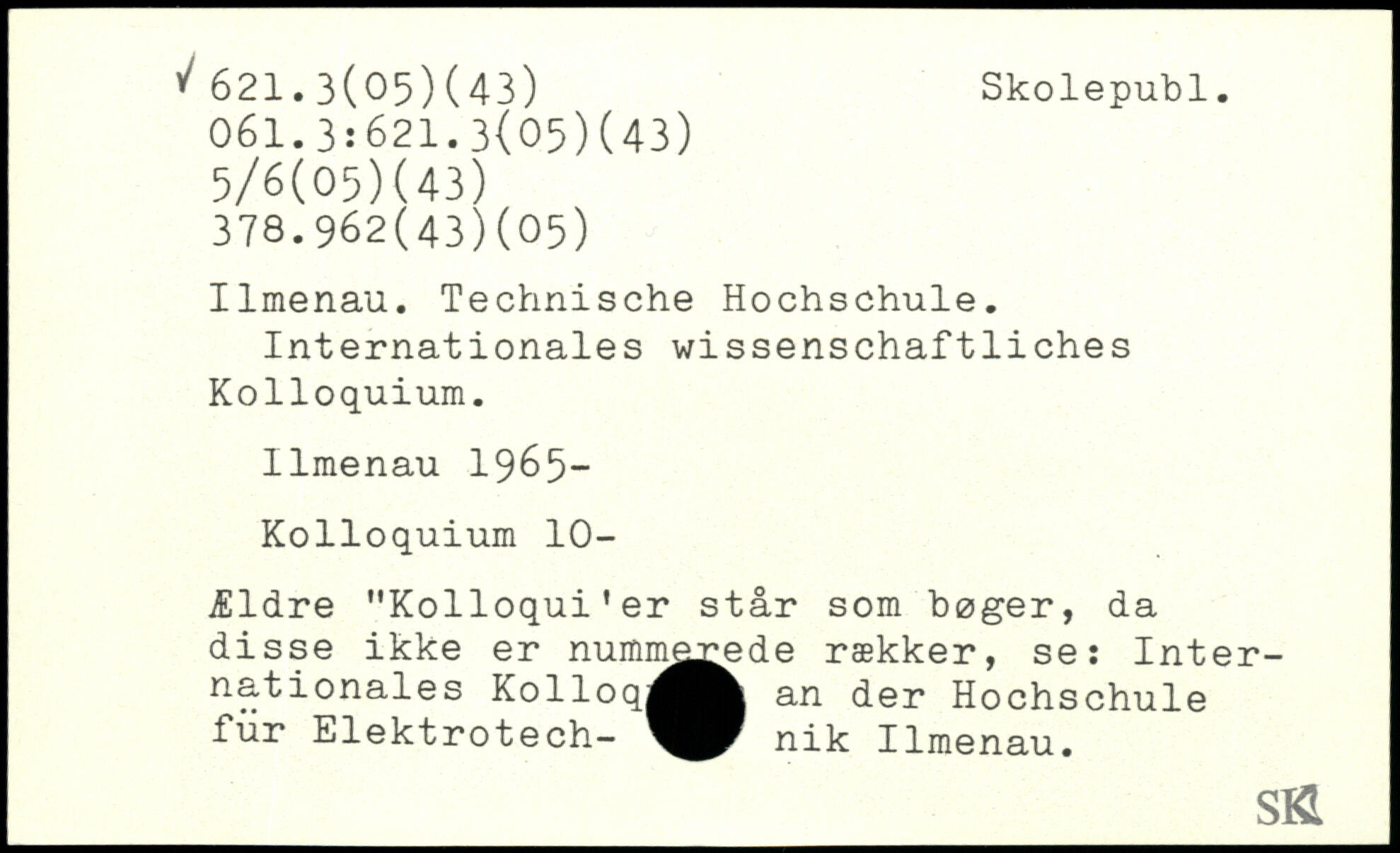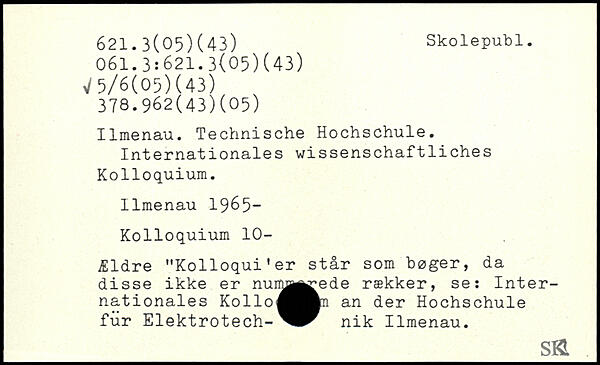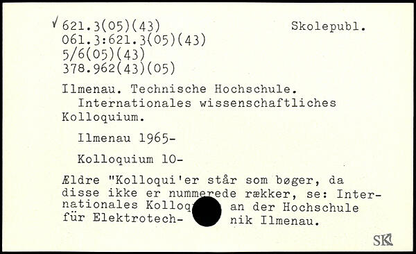 Ilmenau. Technische Hochschule. Internationales wissenschaftliches Kolloquium. Ilmenau 1965- Kolloquium 10- Ældre "Kolloqui’er står som bøger, da disse ikke er numm^ede rækker, se: Internationales Kolloqj^^^ an der Hochschule für Elektrotech- nik Ilmenau.