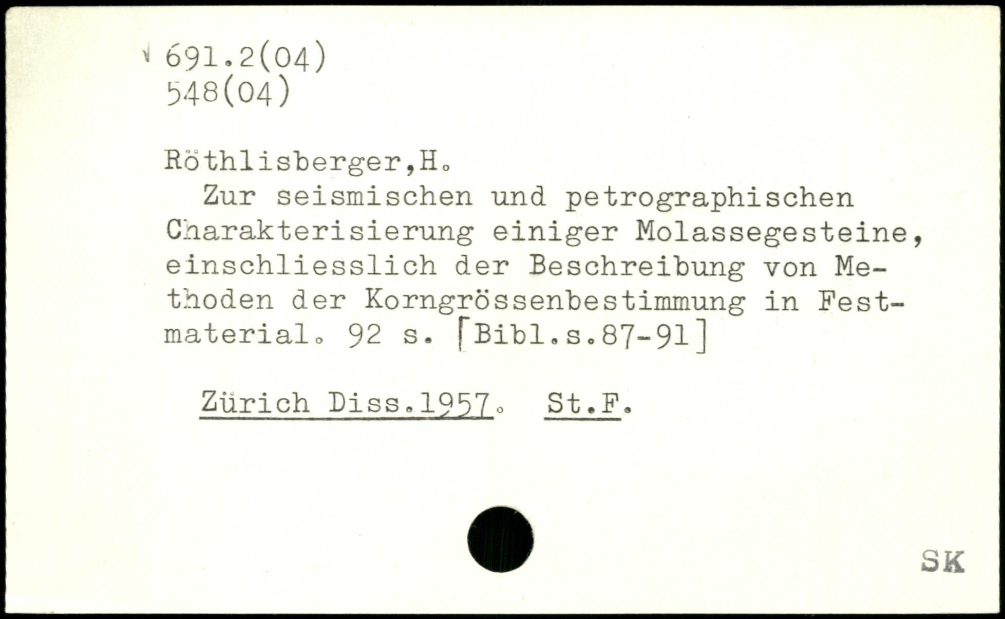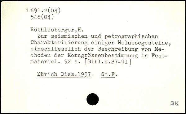 RÖthlisberger,H, Zur seismischen und petrographischen Charakterisierung einiger Molassegesteine, einschliesslich der Beschreibung von Methoden der Korngrössenbestimmung in Fest-materialo