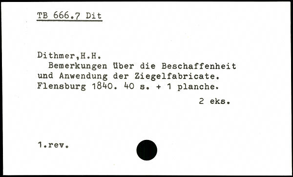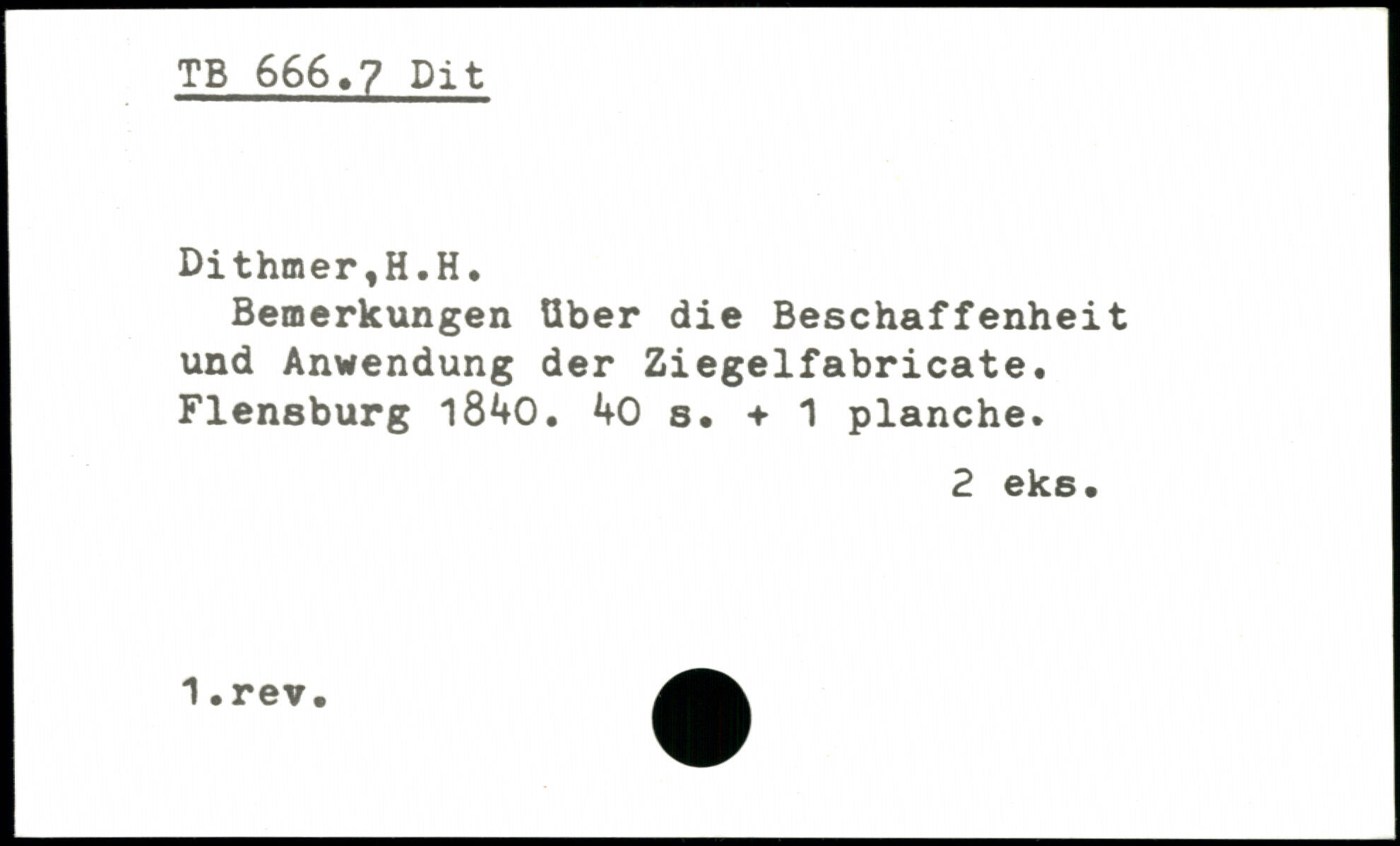 Bemerkungen Uber die Beschaffenheit und Anwendung der Ziegelfabricate. Flensburg 18^0. kO s. ♦ 1 planche.