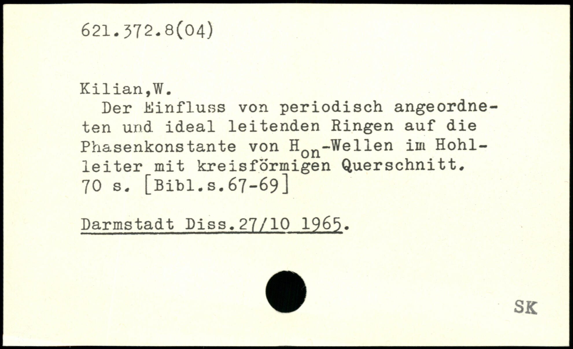 Der Einfluss von periodisch angeordneten und ideal leitenden Ringen auf die Phasenkonstante von Hon-Wellen im Hohlleiter mit kreisförmigen Querschnitt.