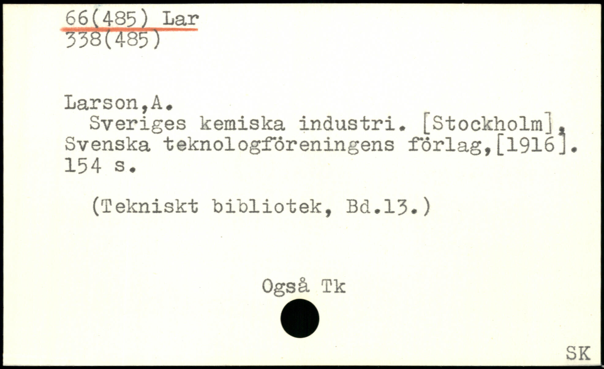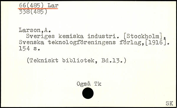 Larson,A. Sveriges kemiska industri. [Stockholm]. Svenska teknologföreningens förlag,[1916J.