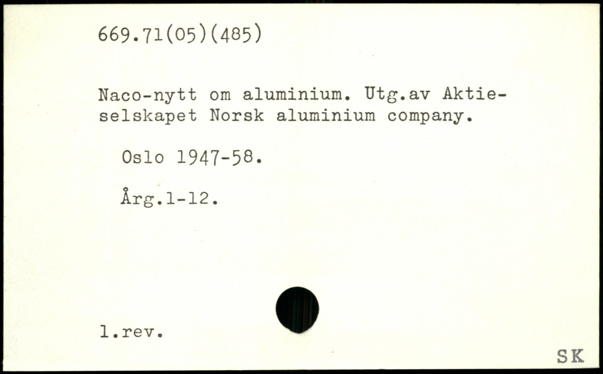 Naco-nytt om aluminium. Utg.av Aktie-selskapet Norsk aluminium company. Oslo 1947-58. Arg.1-12.