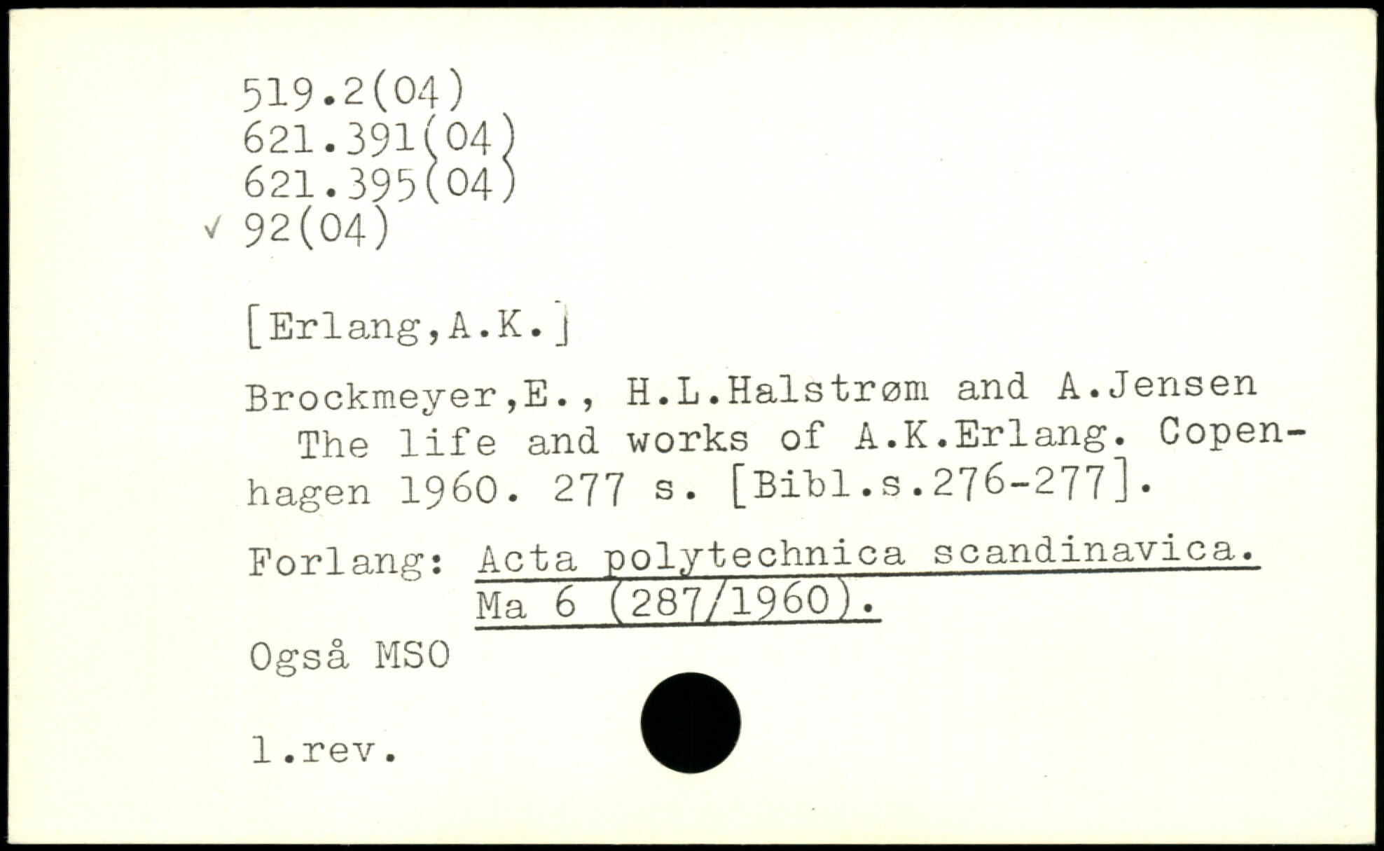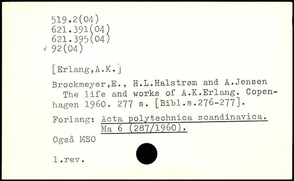 Brockmeyer ,E. , H.L.Halsfrom and A.Jensen The life and works of A.K.Erlang.