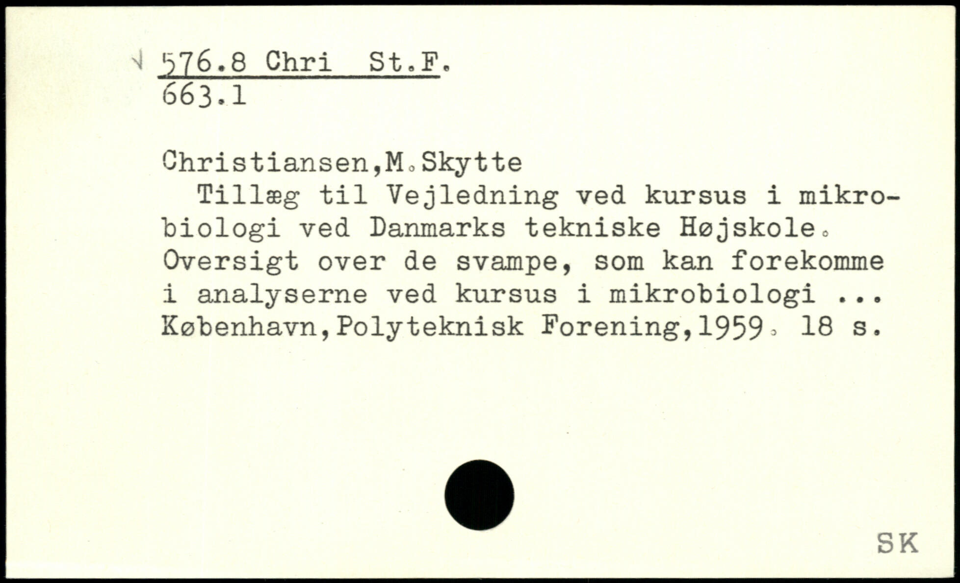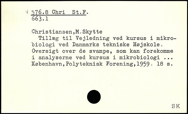 Christiansen,M.Skytte Tillæg til Vejledning ved kursus i mikrobiologi ved Danmarks tekniske Højskole. Oversigt over de svampe, som kan forekomme i analyserne ved kursus i mikrobiologi ...
