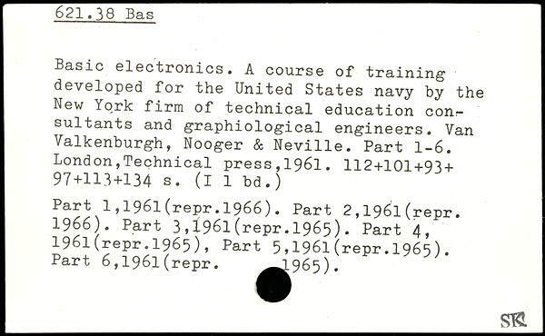 Basic electronics. A course of training developed for the United States navy by the New York firm of technical education conr. sultants and graphiological engineers. Van Valkenburgh, Nooger & Neville. Part 1-6.