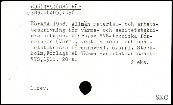 RörAMA 1958. Allmän material- och arbetsbeskrivning för värme- och sanitetstekniska arbeten. Utarb.av VVS-tekniska föreningen (Värme, ventilations- och sani-tetstekniska föreningen), é.uppl. Stockholm,Förlags AB Värme ventilation sanitet VVS,1966.