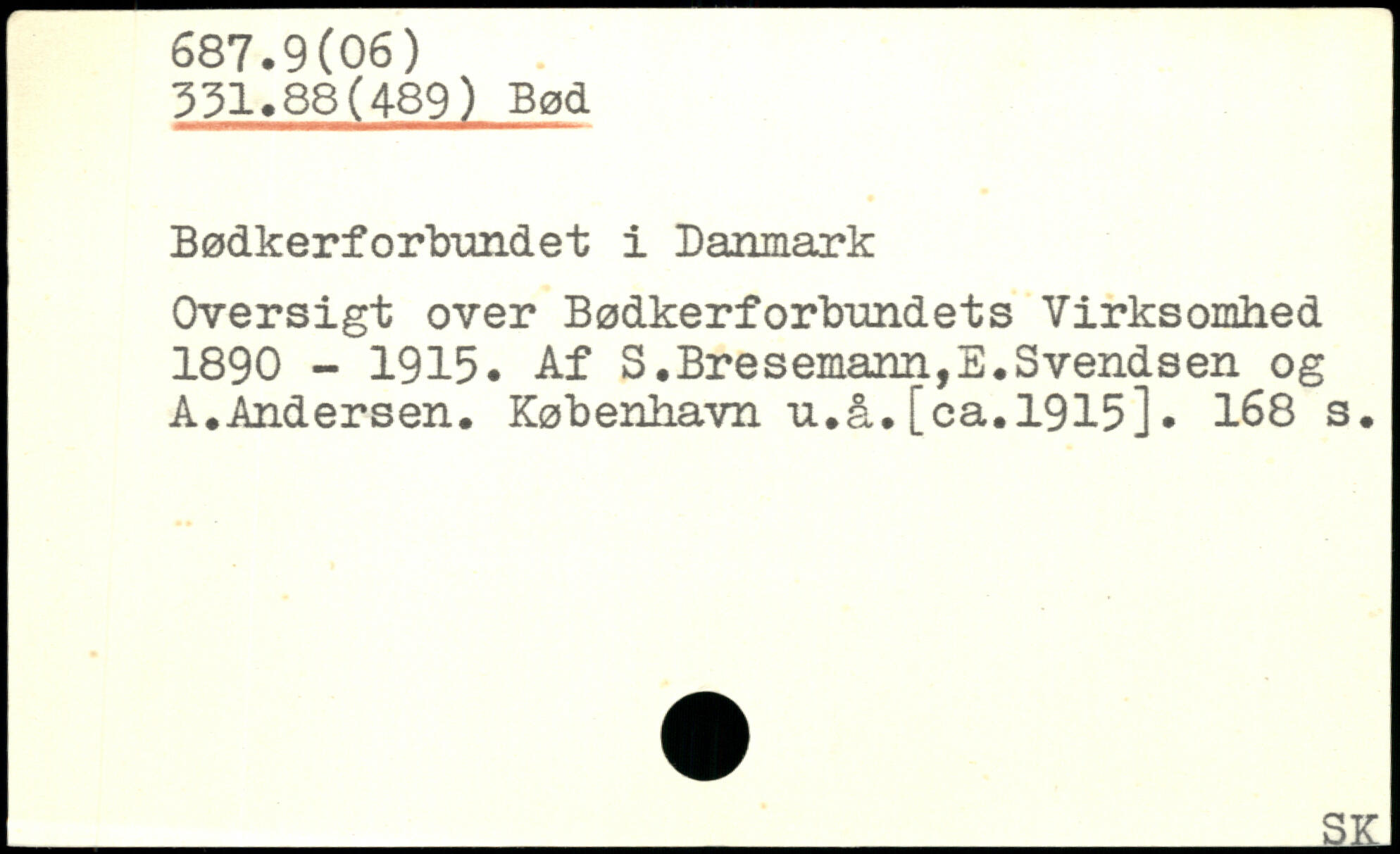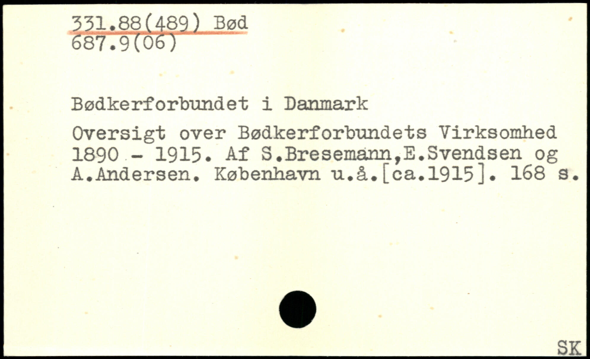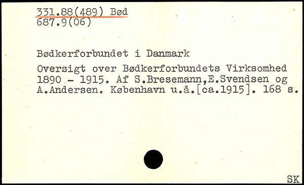 Oversigt over Bødkerforbundets Virksomhed 1890 - 1915. Af S.Bresemann,E.Svendsen og A.Andersen. København u.å.[ca.1915].
