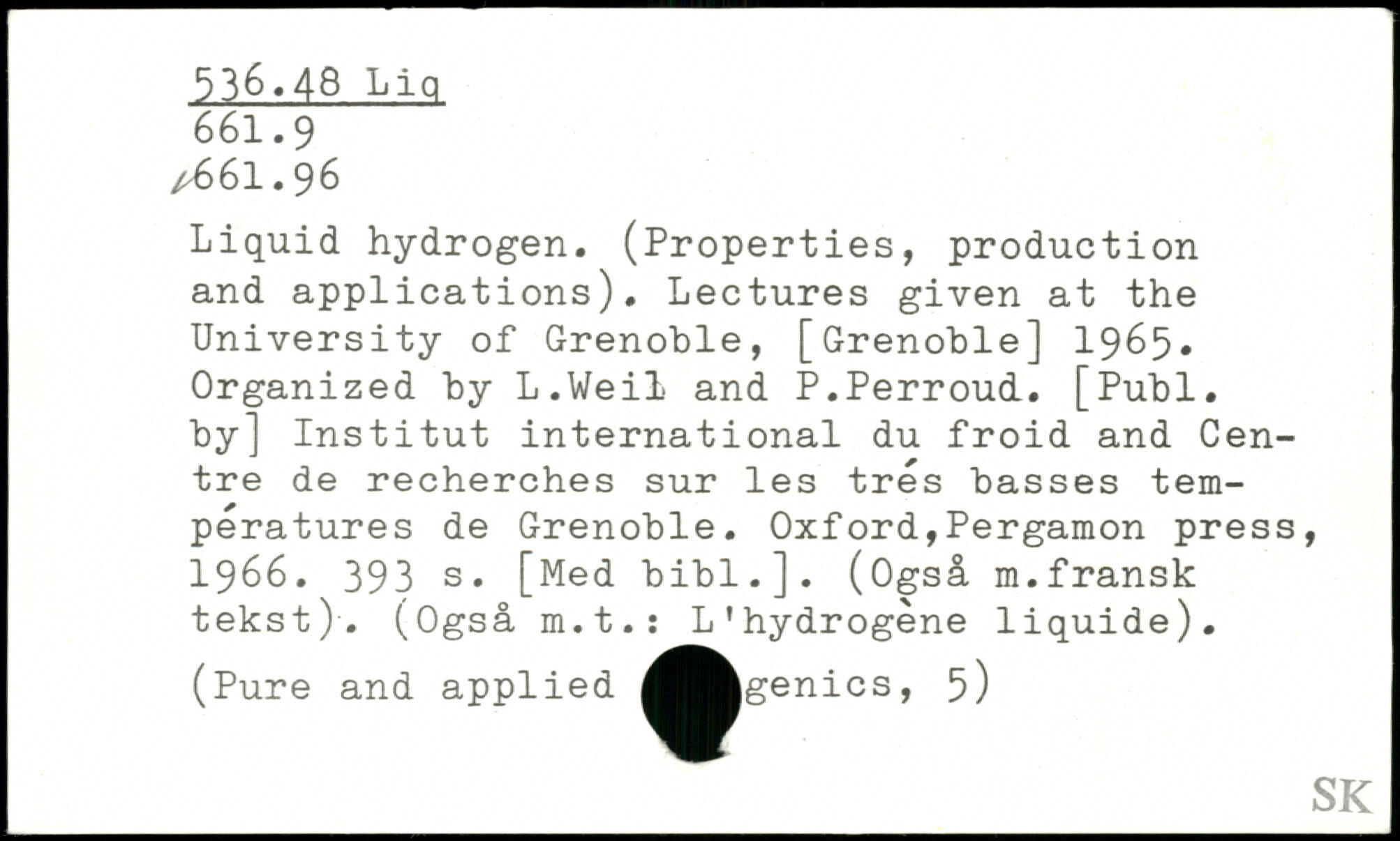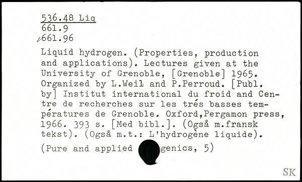 Liquid hydrogen. (Properties, production and applications). Lectures given at the University of Grenoble, [Grenoble] 1965. Organized by L.Weil and P.Perroud.