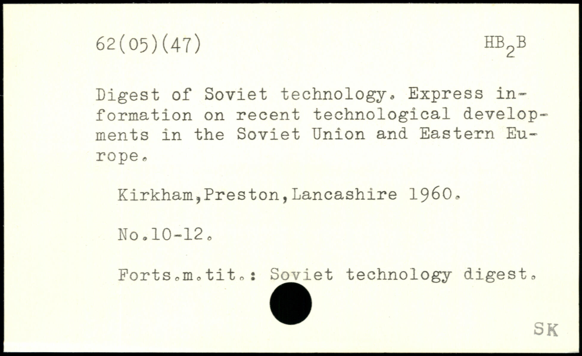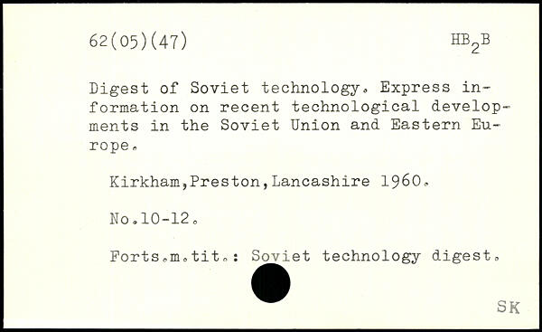 Digest of Soviet technology,. Express information on recent technological developments in the Soviet Union and Eastern Europe , Kirkham,Preston,Lancashire 1960,. No.10-12. Forts,m,tit,: Soviet technology digest