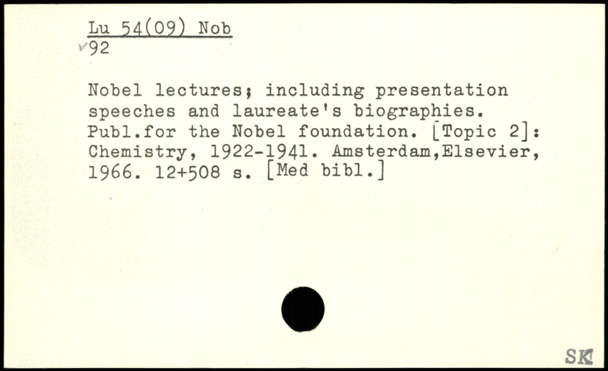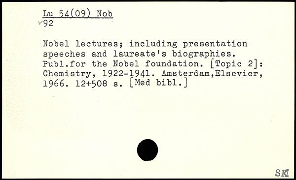 Nobel lectures; including presentation speeches and laureate's biographies. Publ.for the Nobel foundation. [Topic 2]s Chemistry, 1922-1941.