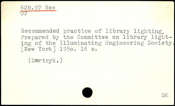 Recommended practice of library lighting. Prepared by the Committee on library lighting of the Illuminating Engineering Society. [New York] 195o.